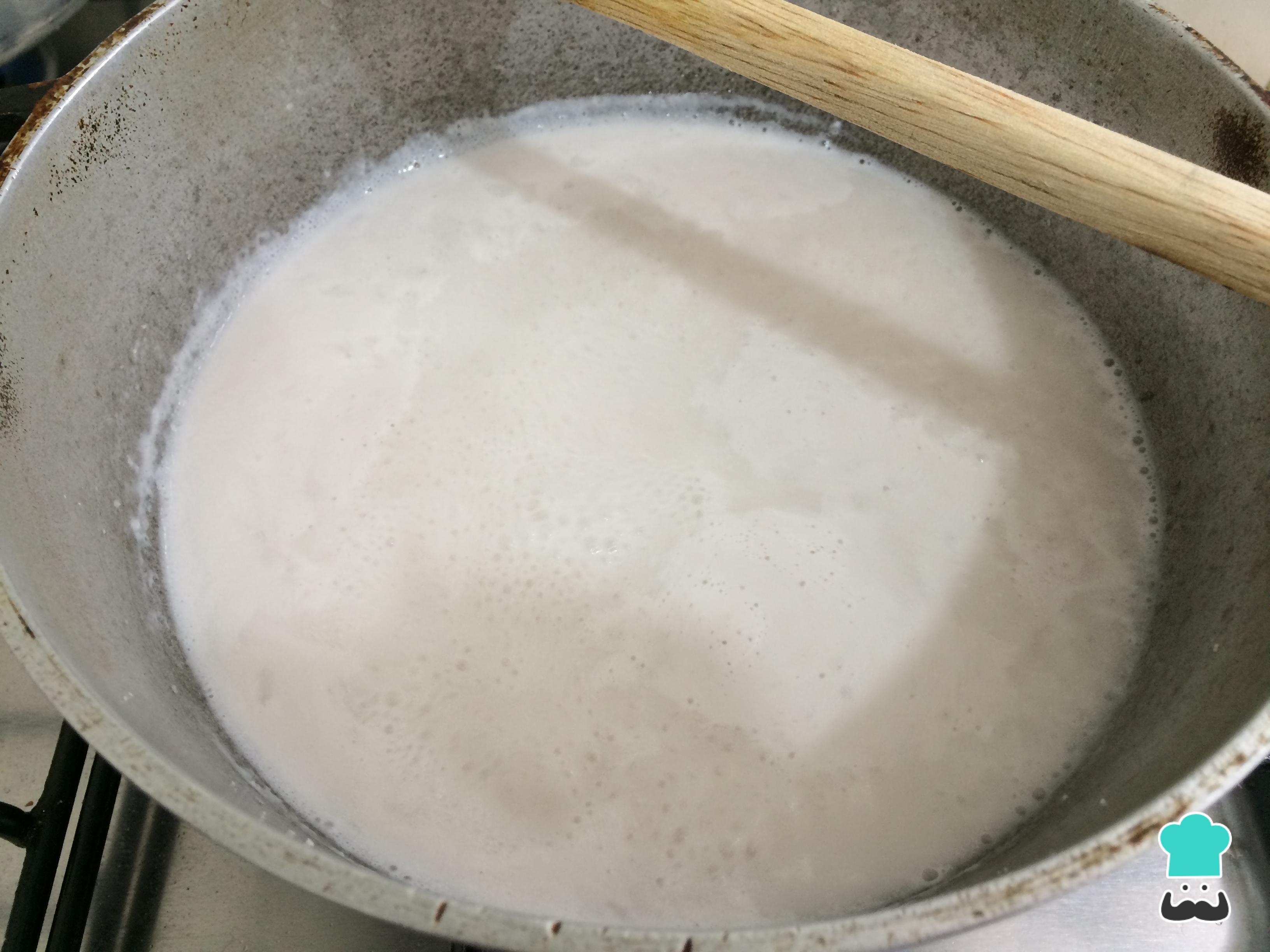 Agregar las dos tazas de leche de coco a una olla, cocinar a fuego lento hasta que rompan hervor, añadir el azúcar y la sal.