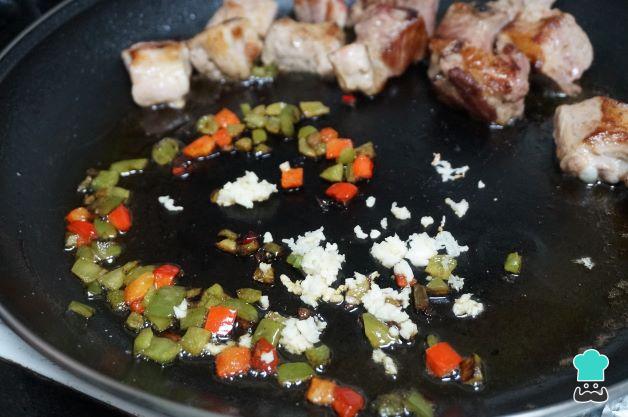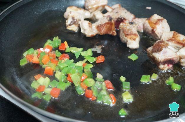 Coloca una paella con un chorro de aceite de oliva a fuego medio y pon a dorar las costillas, deja que se doren por fuera. A continuación, pica el pimiento rojo y el pimiento verde, añádelo a la cazuela que se vaya cocinando.