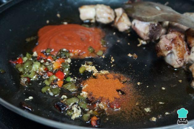Añade el tomate triturado y la cucharadita de postre de pimentón dulce. Mezcla todo y deja que se cocine unos minutos hasta que se haga el sofrito, con cuidado no se queme. Puedes utilizar tomate natural, solo tienes que pelar 3-4 tomates, los picas y deja se hagan junto con las verduras.