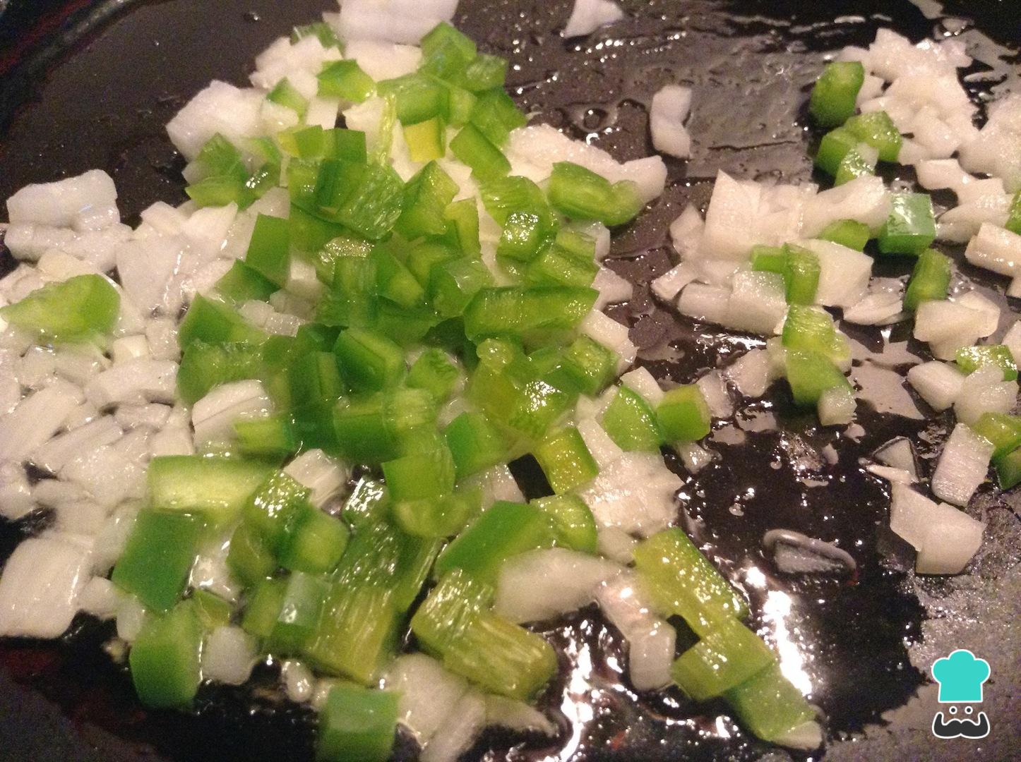 Lleva una sartén a fuego medio con el aceite de oliva y haz el sofrito base. Añade la cebolla blanca y el pimiento o pimentón finamente picado, saltea durante algunos minutos.
