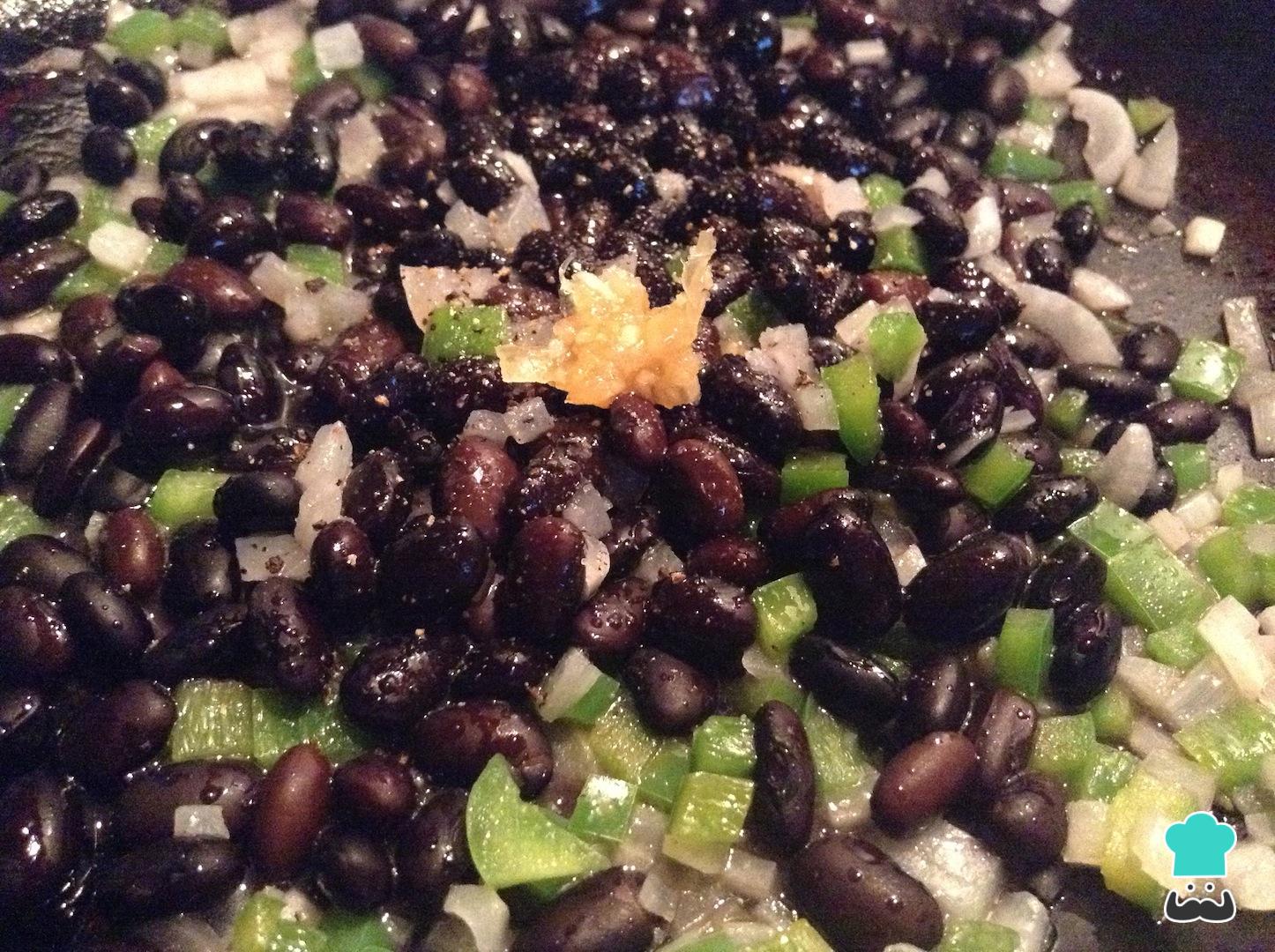 Añade al sofrito los frijoles negros cocidos, sal, pimienta negra y pasta de ajo al gusto. Mezcla bien los ingredientes.