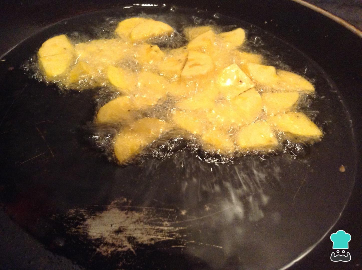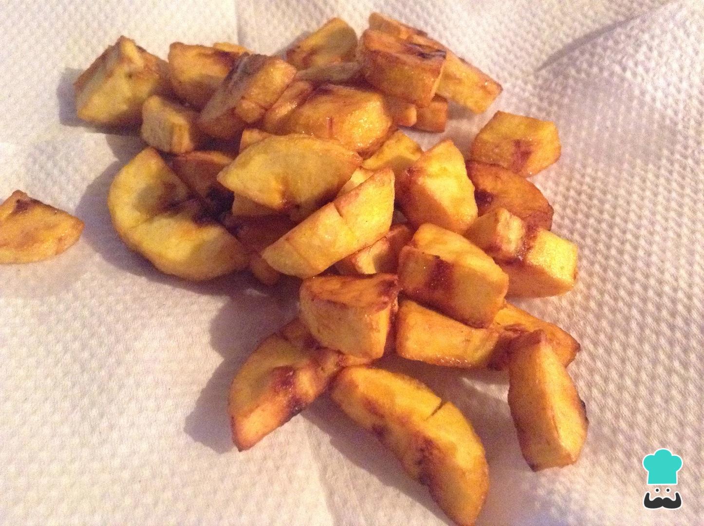 Aparte, lleva a fuego medio un sartén con suficiente aceite para freír y una vez caliente, adiciona el plátano maduro en cuadros. Cocina bien hasta que estén dorados.