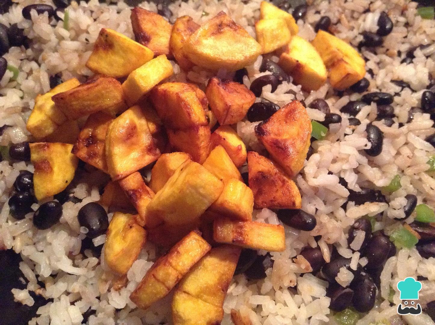 Por último, añade los plátanos a nuestro arroz con frijoles e integra bien con nuestra receta cubana.