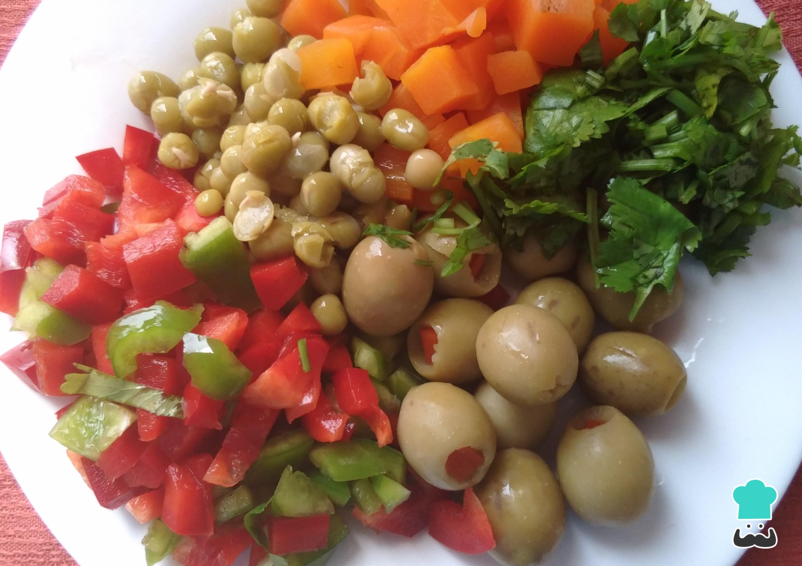 También adiciona el resto de los ingredientes: más cilantro, aceitunas, las zanahorias ya hervidas y picadas y guisantes. También los pimentones rojos y verdes que reservaste anteriormente.