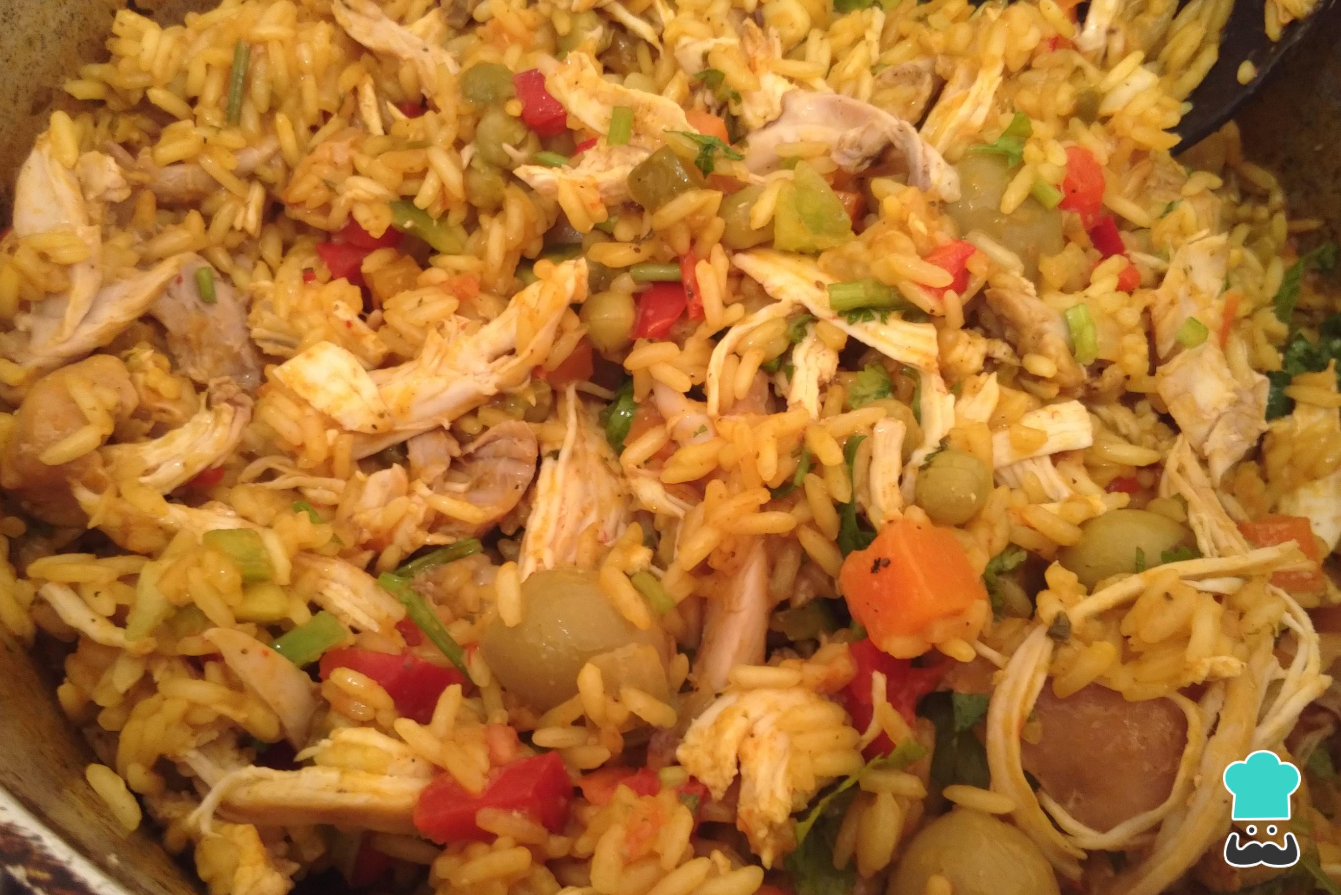 se le agrega agua al arroz y se deja cocinar hasta que seque el agua. Luego se hilacha la pechuga y se vierte en el arroz junto con los vegetales, se revuelve y se añade aceitunas rellenas y swet peas si desea. Puede servir un rico y original plato panameño.