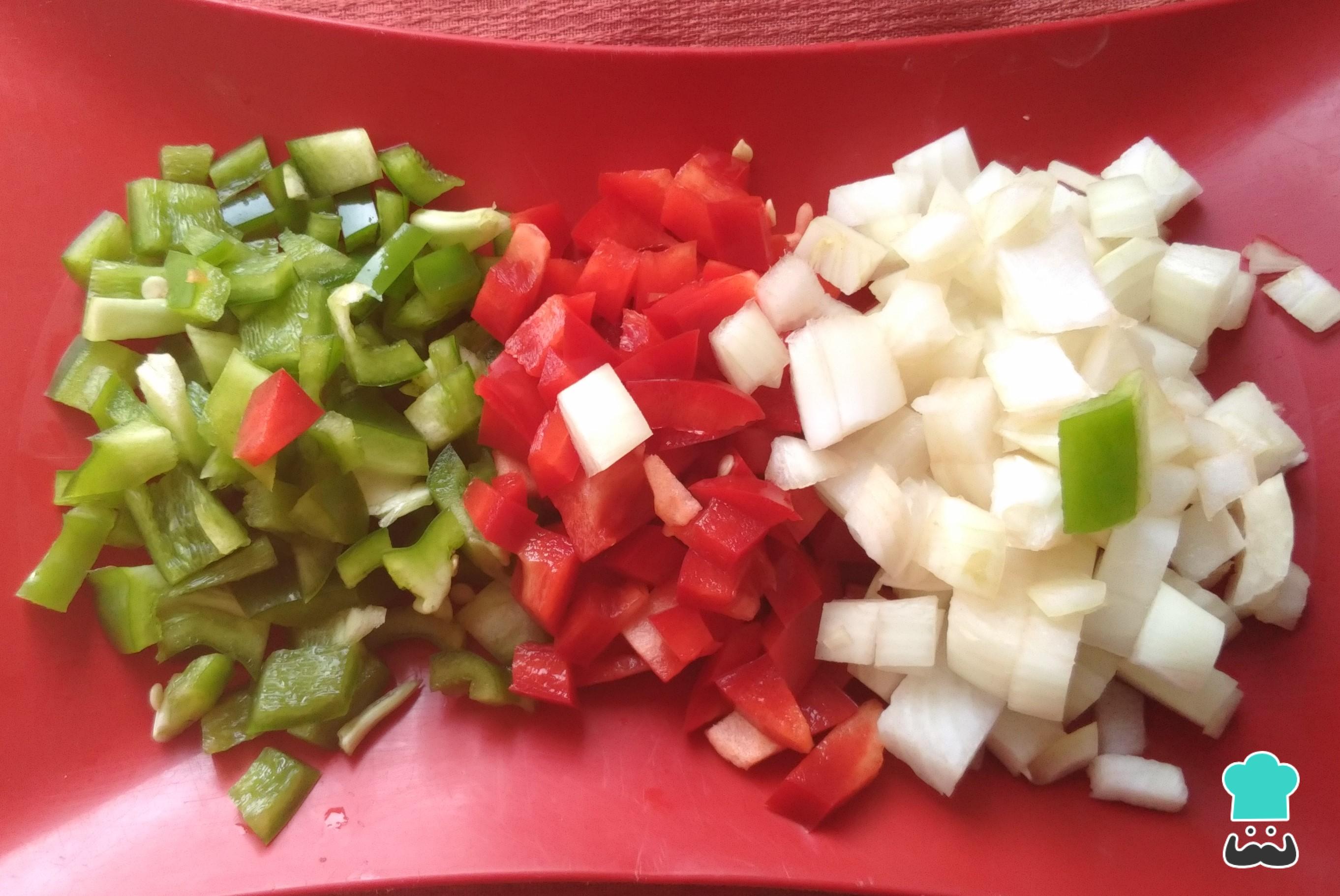 Pica en cuadritos la cebolla y los pimentones verde y rojo.