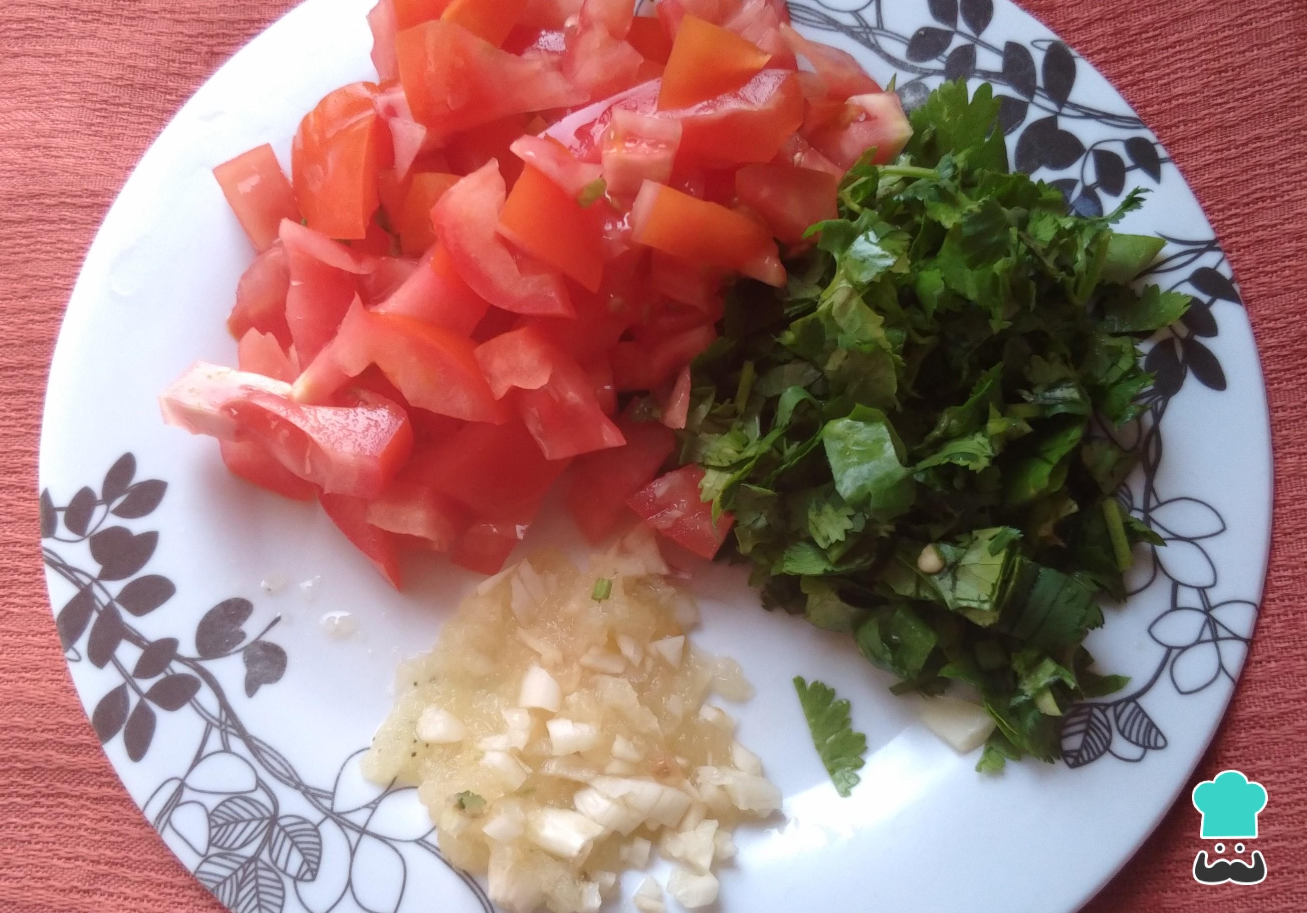 También pica los tomates y el cilantro. Igualmente, ralla o machaca los dientes de ajos.