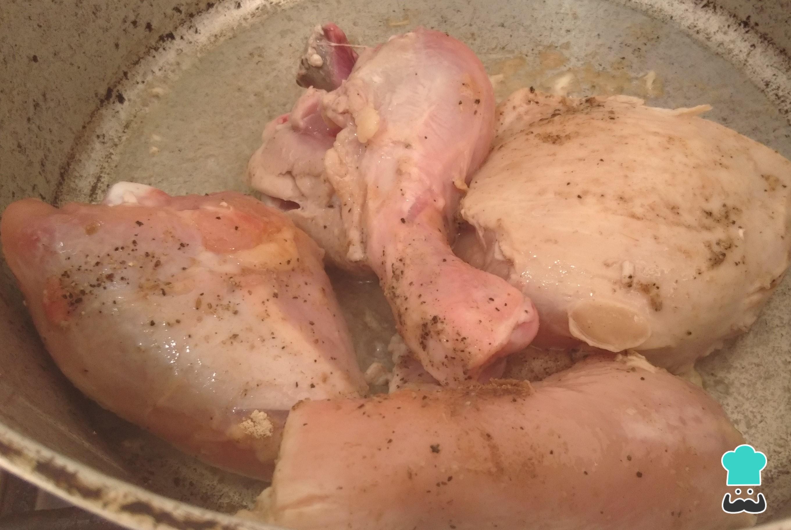Sofríe hasta dorar las piezas de pollo en unas tres cucharadas de aceite. Esto tomará unos 5 minutos.