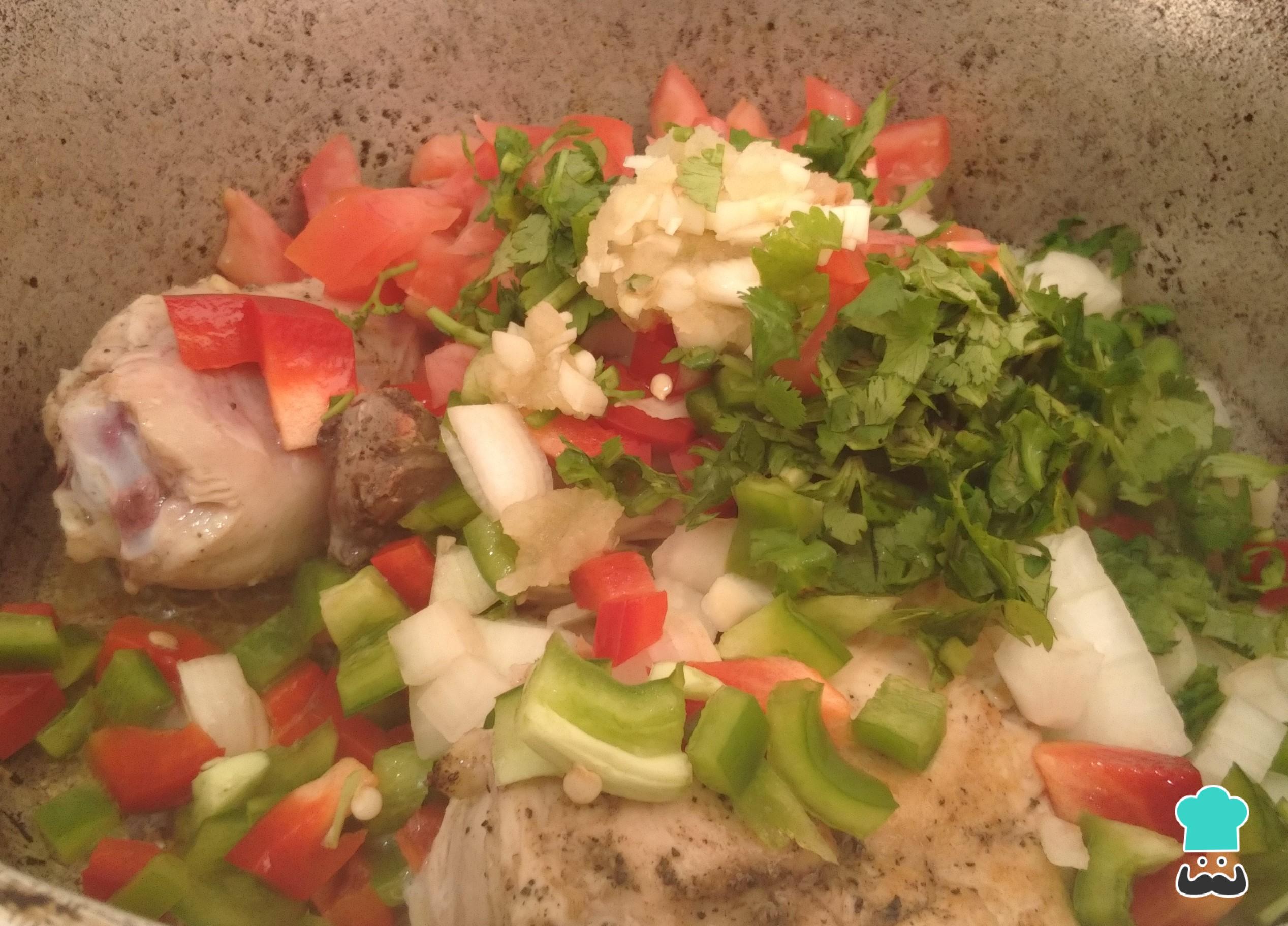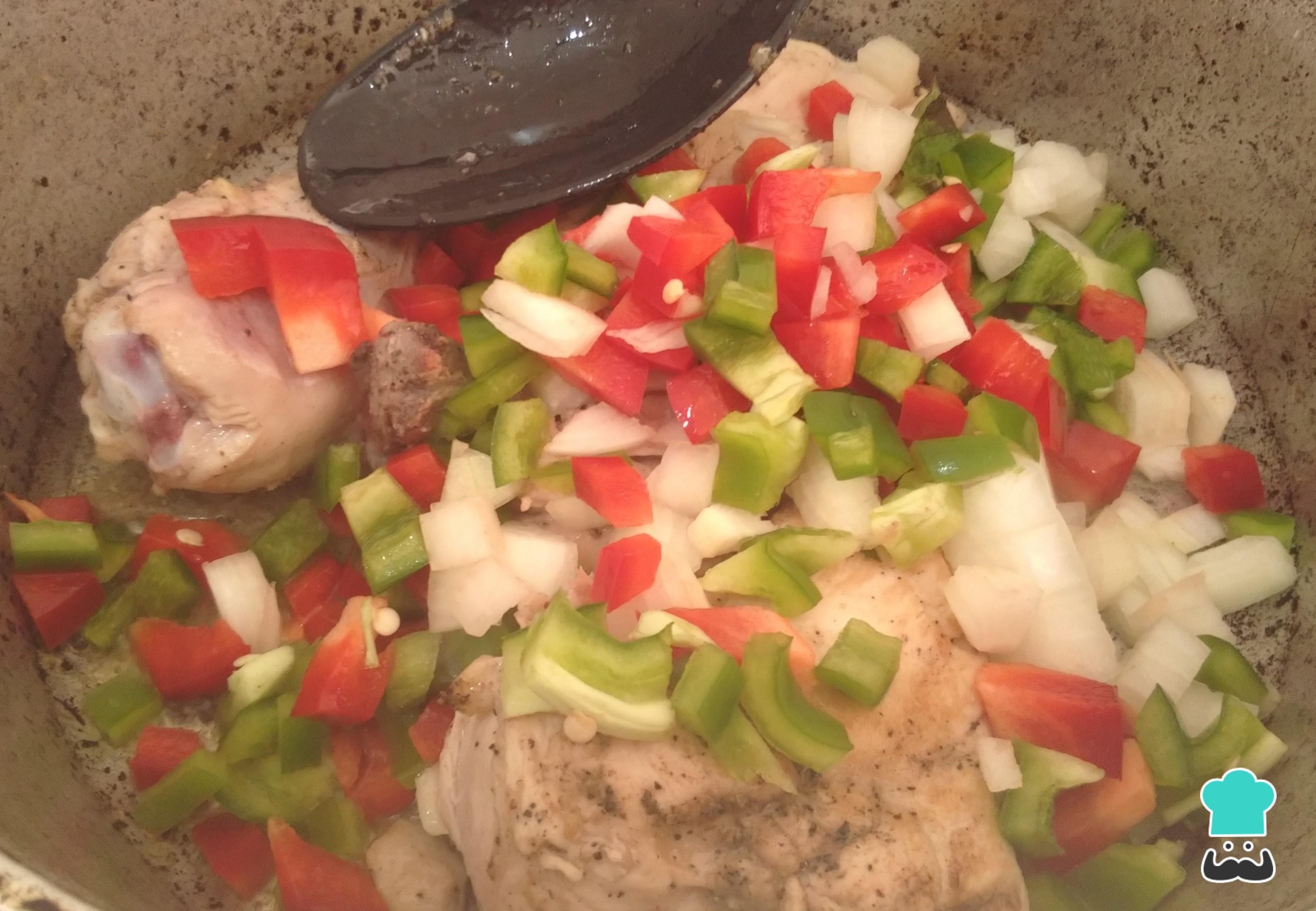 Luego, agrega la cebolla y los pimentones. Reserva un poco de estos últimos para la cocción final. Revuelve con el pollo.
