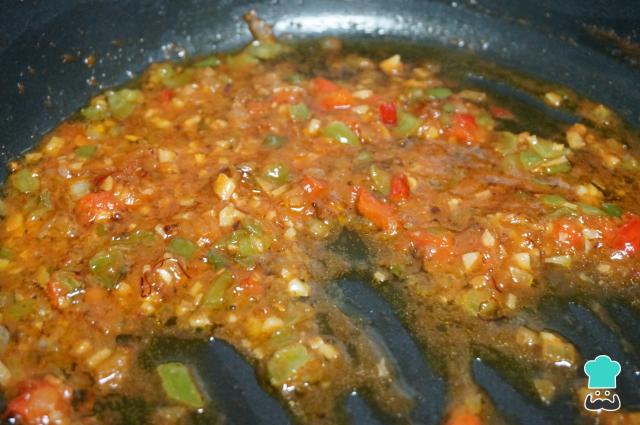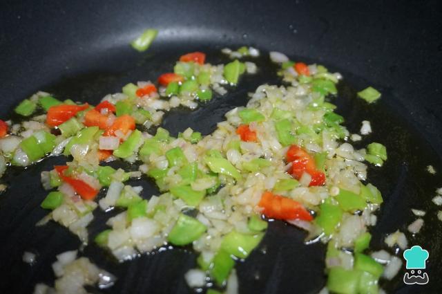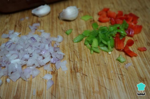 Picamos las verduras, es decir, la cebolla, el pimiento rojo y el pimiento verde y los dientes de ajo. Recomendamos picar todos los ingredientes en trozos de igual tamaño.