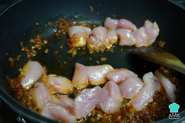 Cortamos el pollo en trozos, salamos y los agregamos a la cazuela con el sofrito. Dejamos que se cocine todo junto, removiendo de vez en cuando para evitar que se queme.