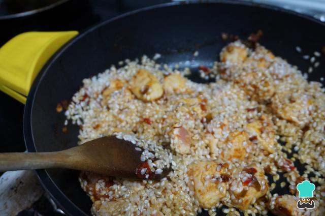 Incorporamos el arroz y removemos para que se integren bien todos los sabores y, a su vez, se tueste un poco el cereal.