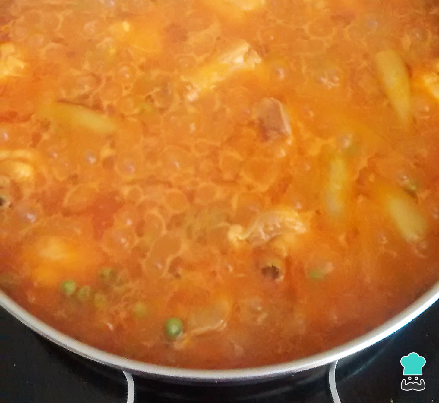 Unos 15 minutos antes de finalizar el tiempo de cocción indicado, añadimos un tomate troceado. Y unos 5 min antes echamos el tomate frito removiendo para que se mezclen los sabores. La cantidad de tomate frito irá a gusto.