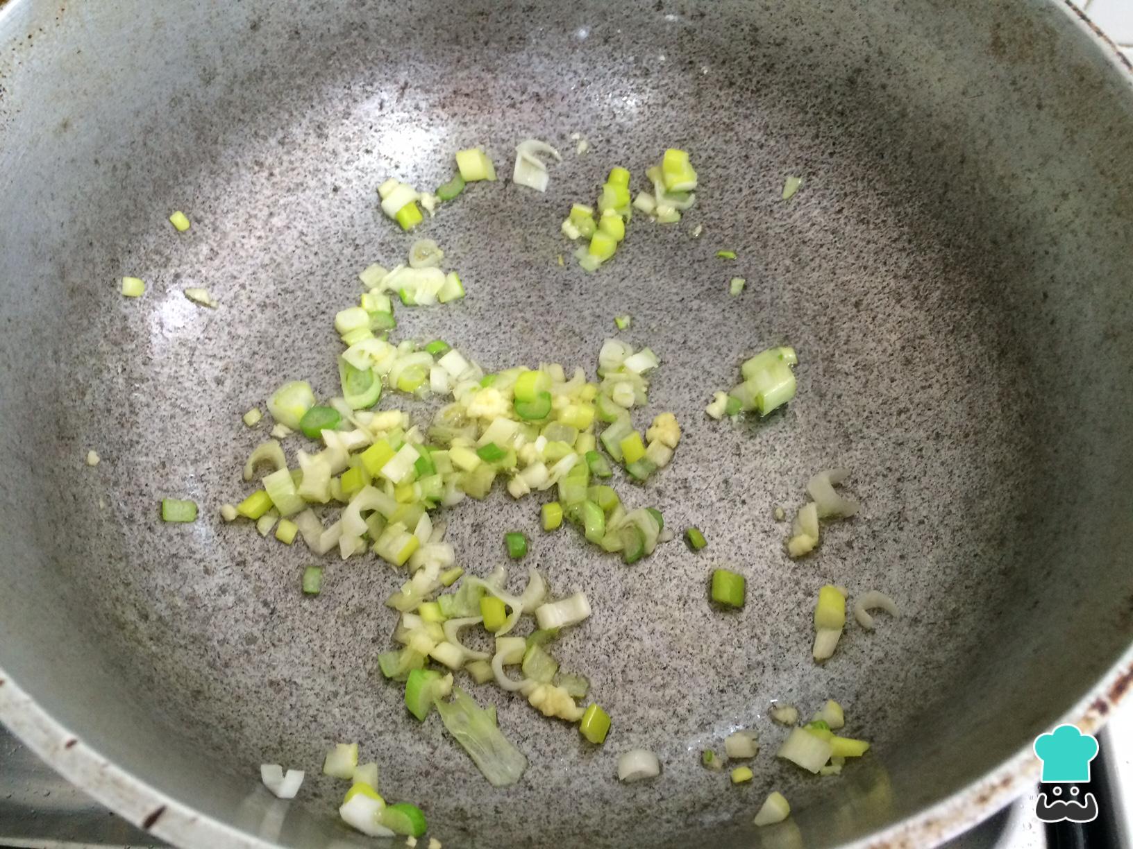 En una olla con aceite de oliva, sofríe la cebolla y el ajo, todo cortado finamente, hasta que esté blando.