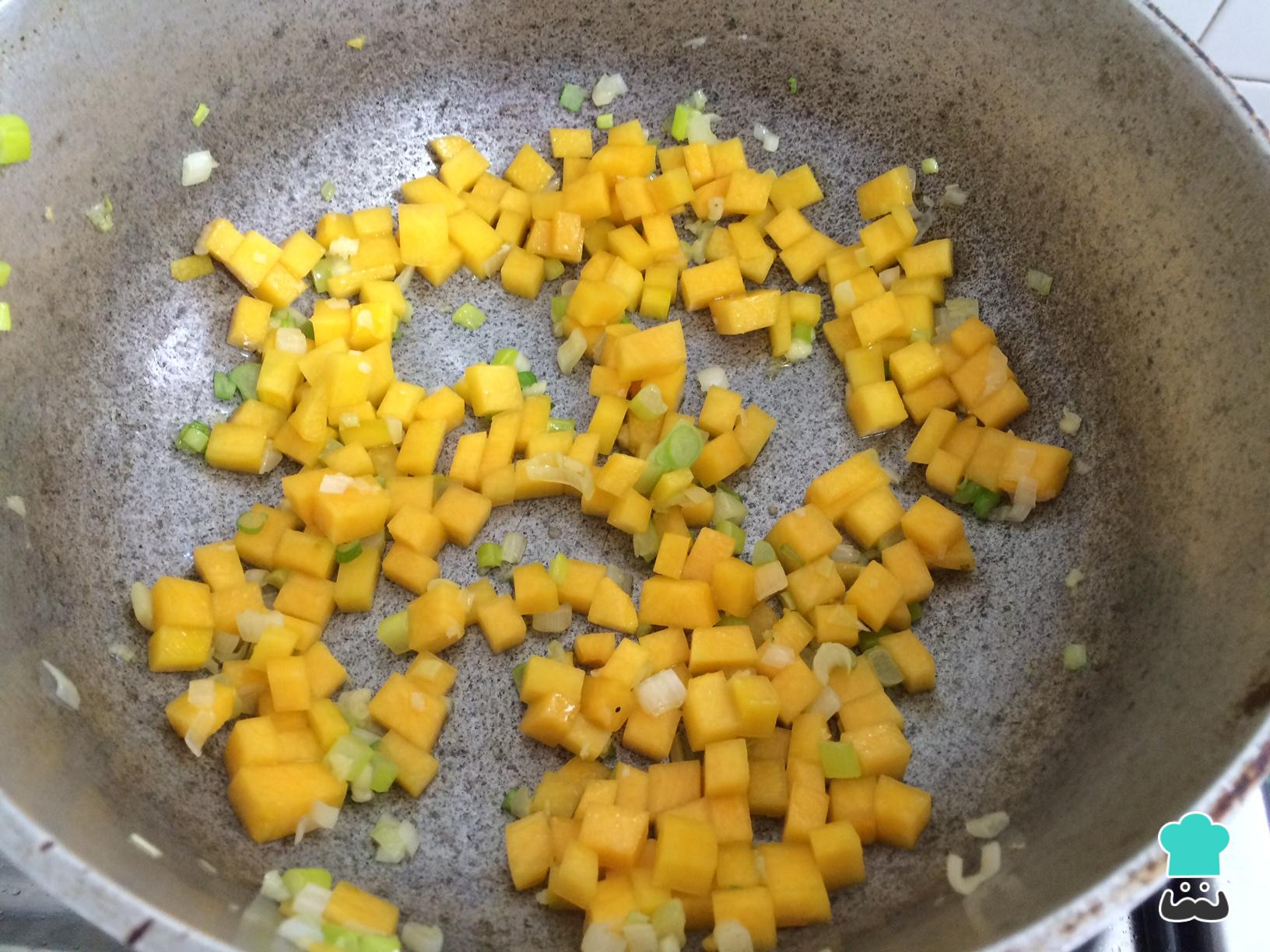 Añade la calabaza cortada en cubos pequeños y sofríela a fuego bajo durante cinco minutos. Salpimenta al gusto.
