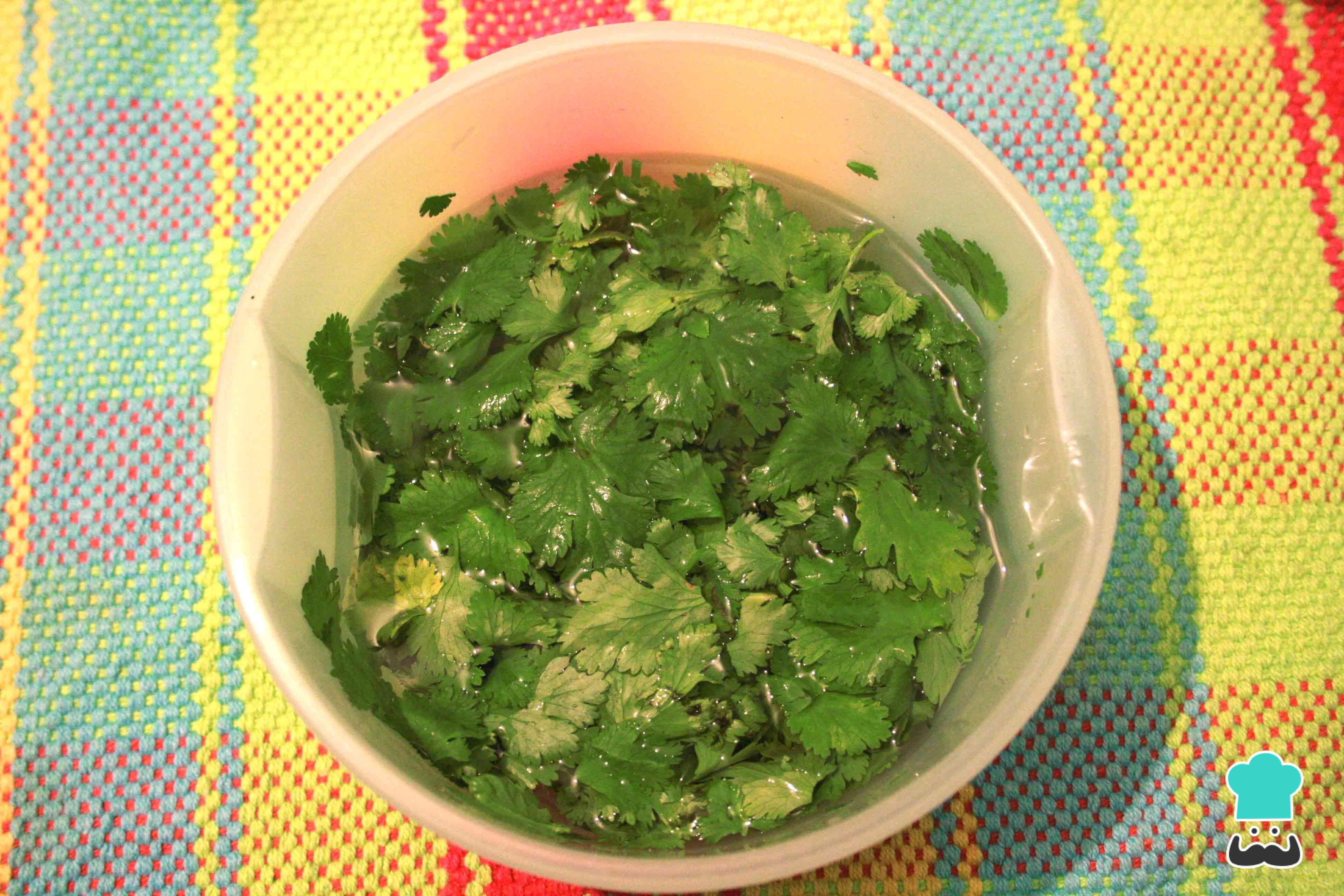 Mientras, coloca en un bol el cilantro con agua y un chorrito de vinagre. Pasado un minuto, cuela. Reserva el cilantro.