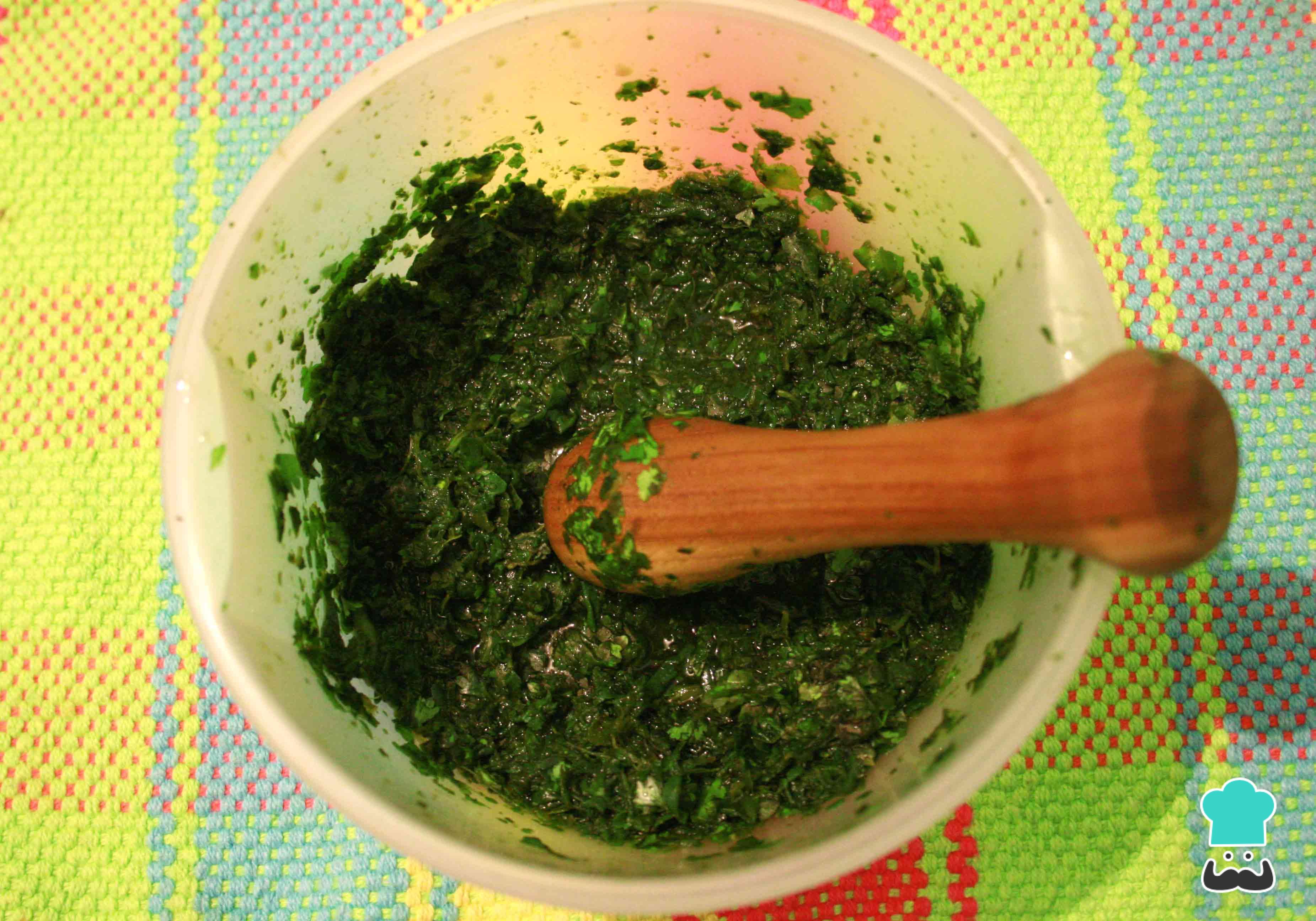 Si no posees licuadora, puedes triturar todas las hierbas con el mortero. Si posees un mortero muy pequeño, reemplaza la base por un bol. Cualquier ayudante de cocina puede facilitarte este trabajo, yo sólo te propongo más alternativas.