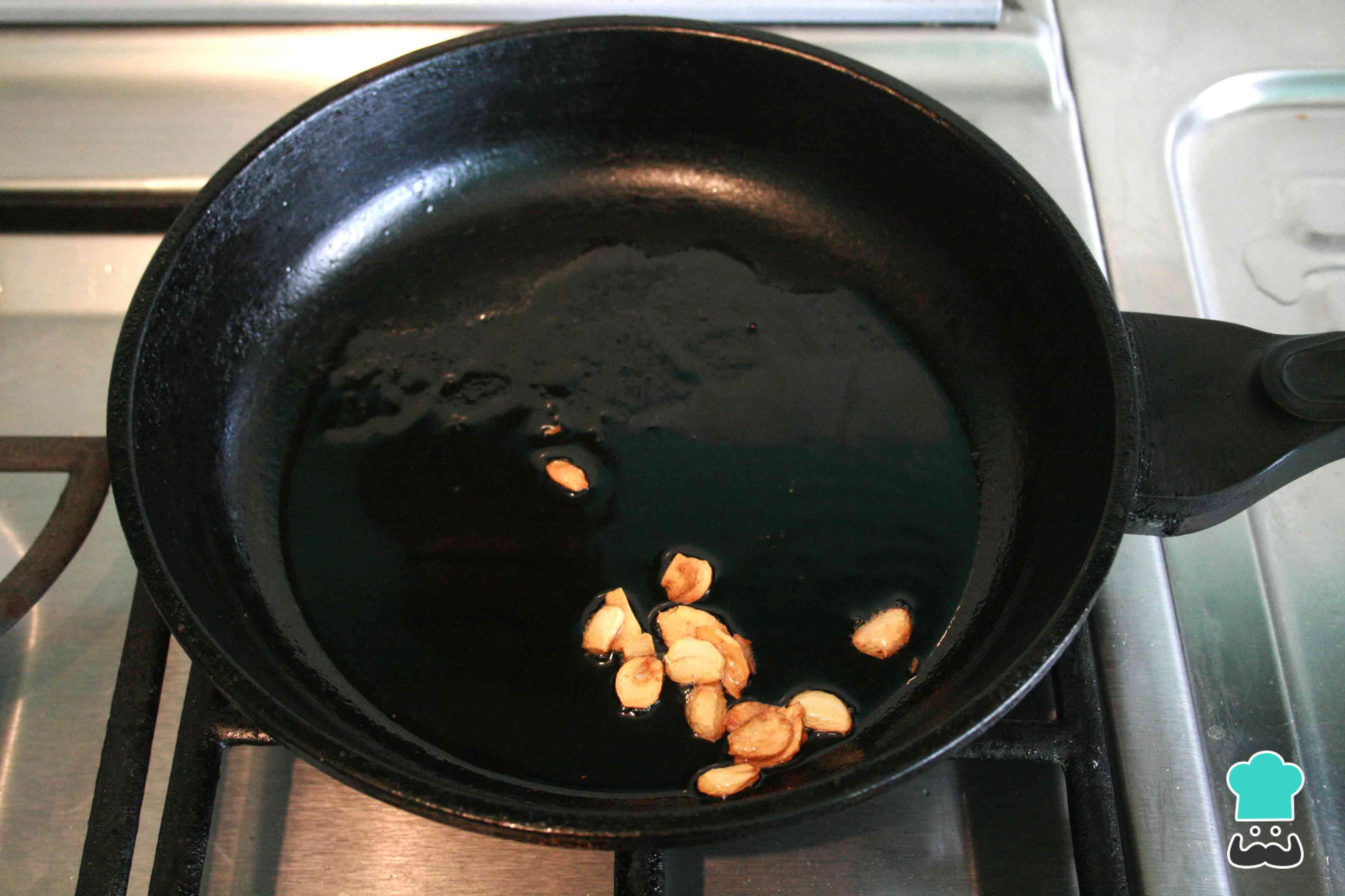 Vierte aceite de oliva en una paila, y espera a que caliente. Dora los ajos en el aceite a fuego medio. Retira los ajos de la sartén y resérvalos. Coloca el arroz y sofríelo con el mismo aceite en que cocinaste los ajos. Remueve hasta dorar un poco pero no te excedas.