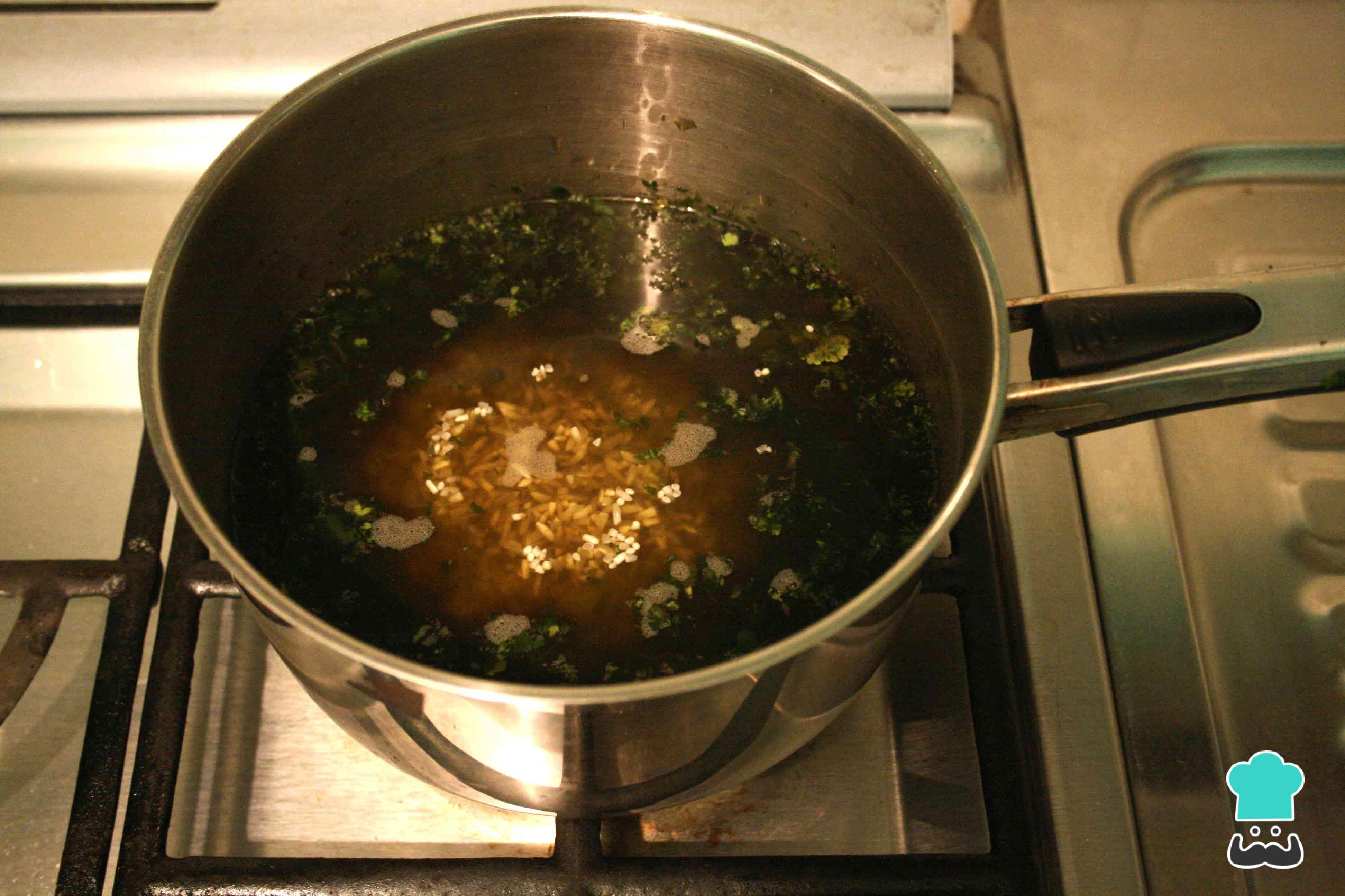 Vierte las 4 tazas de agua en la cacerola. Agrega el arroz, los ajos y el aceite de oliva. Cocina a fuego medio. Deja que se consuma el agua y cuando suceda, baja el fuego a mínimo y tapa. Espera 5 minutos y apaga. ¡Igual que cuando cocinas arroz común!