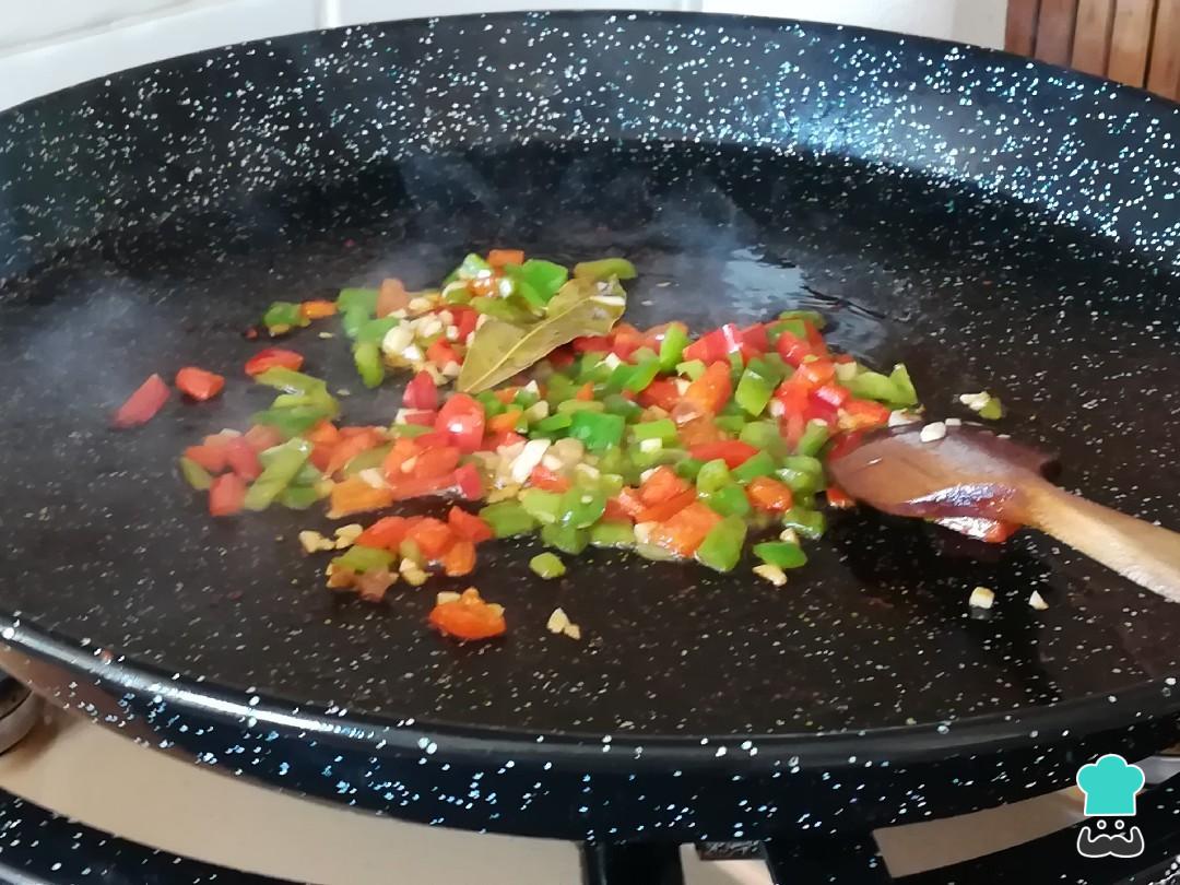 Reservar y en la misma grasa sofreír los pimientos y los ajos.