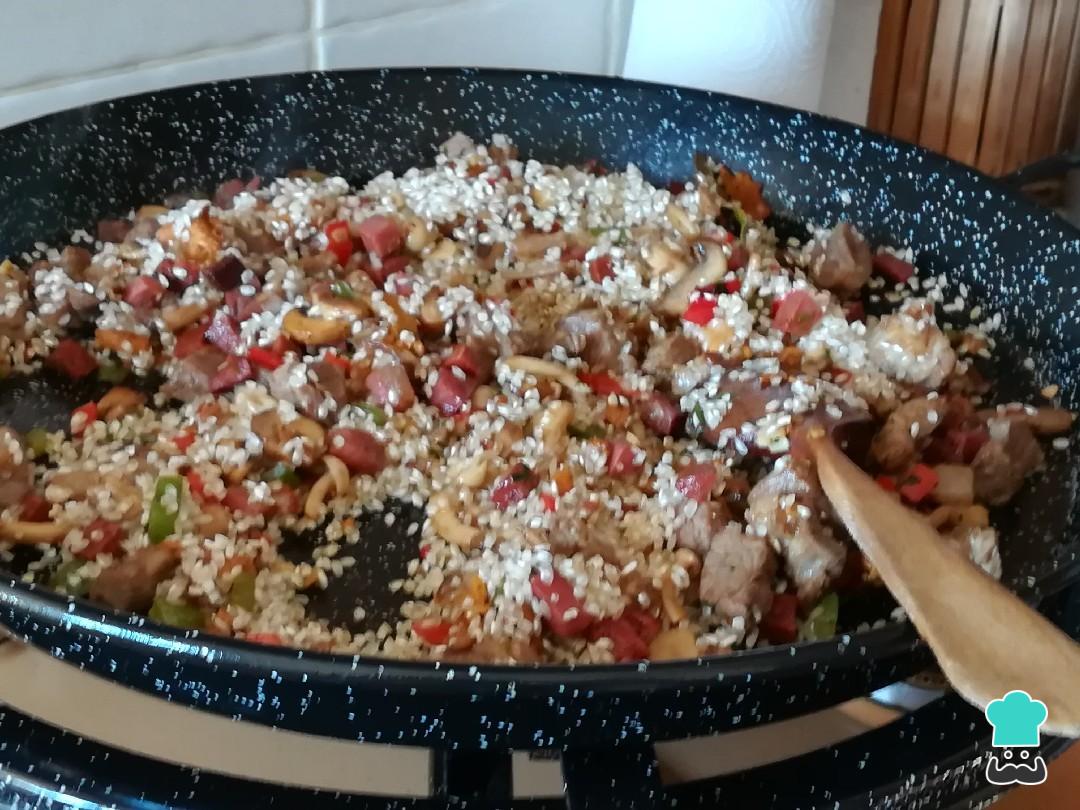 Añadir las carnes y el arroz, rehogar todo y dejar un rato que se junten todos los sabores del arroz montañés catalán.