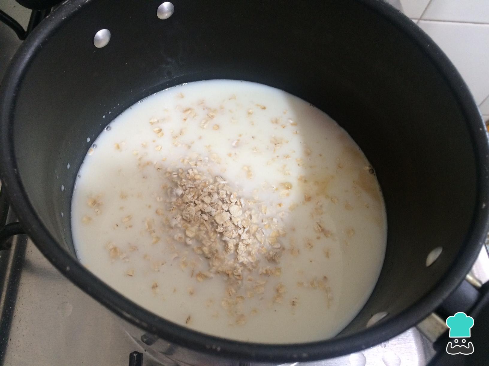 En una olla añade la avena con la leche, la esencia de vainilla, la canela en polvo y una cucharada de azúcar. Mezcla todo muy bien y deja cocinar a fuego bajo durante 10 minutos, hasta obtener una avena suave y espesa.
