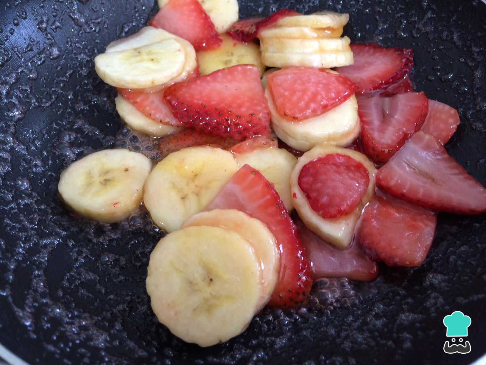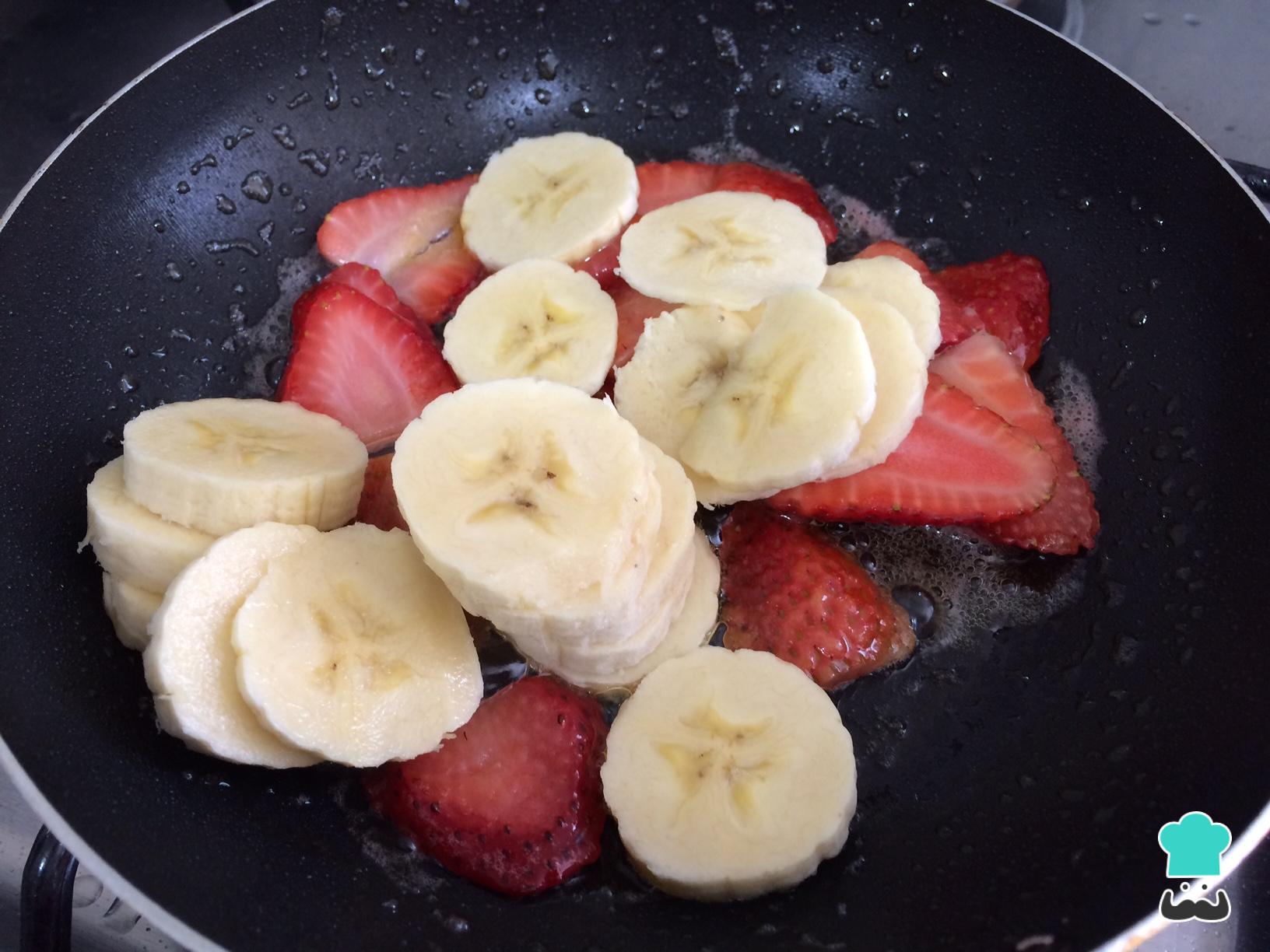 Aparte, en una sartén derrite la mantequilla con una cucharada de azúcar. Cuando el azúcar se disuelva, agrega las fresas y el plátano, todo cortado en rodajas, y deja cocinar a fuego muy bajo.