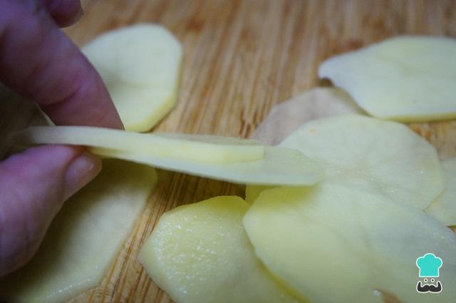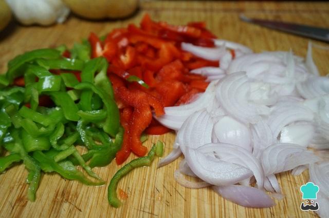 Para preparar la receta de bacalao al horno con verduras y patatas, lo primero será lavar y cortar las cebollas y los pimientos en tiras finas.