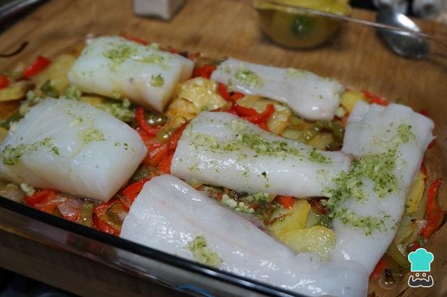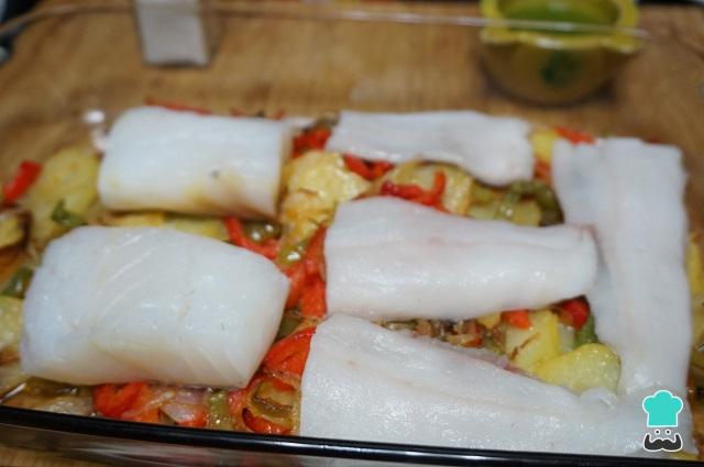 Pasado el tiempo anterior, sacamos la bandeja de las verduras y ponemos encima los lomos de bacalao.