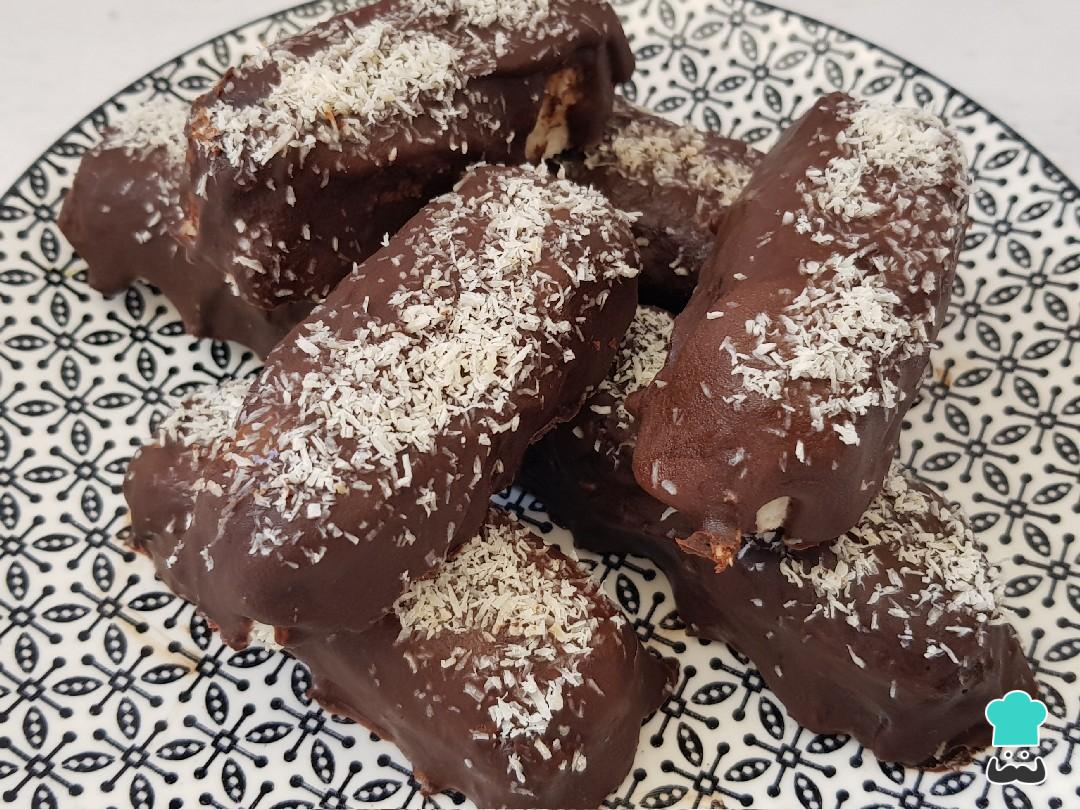 Sumerge las barritas de coco veganas en el bol con el chocolate cubriéndolas bien. Luego, espolvorea un poco de coco rallado por encima y vuelve a colocarlas en la bandeja.