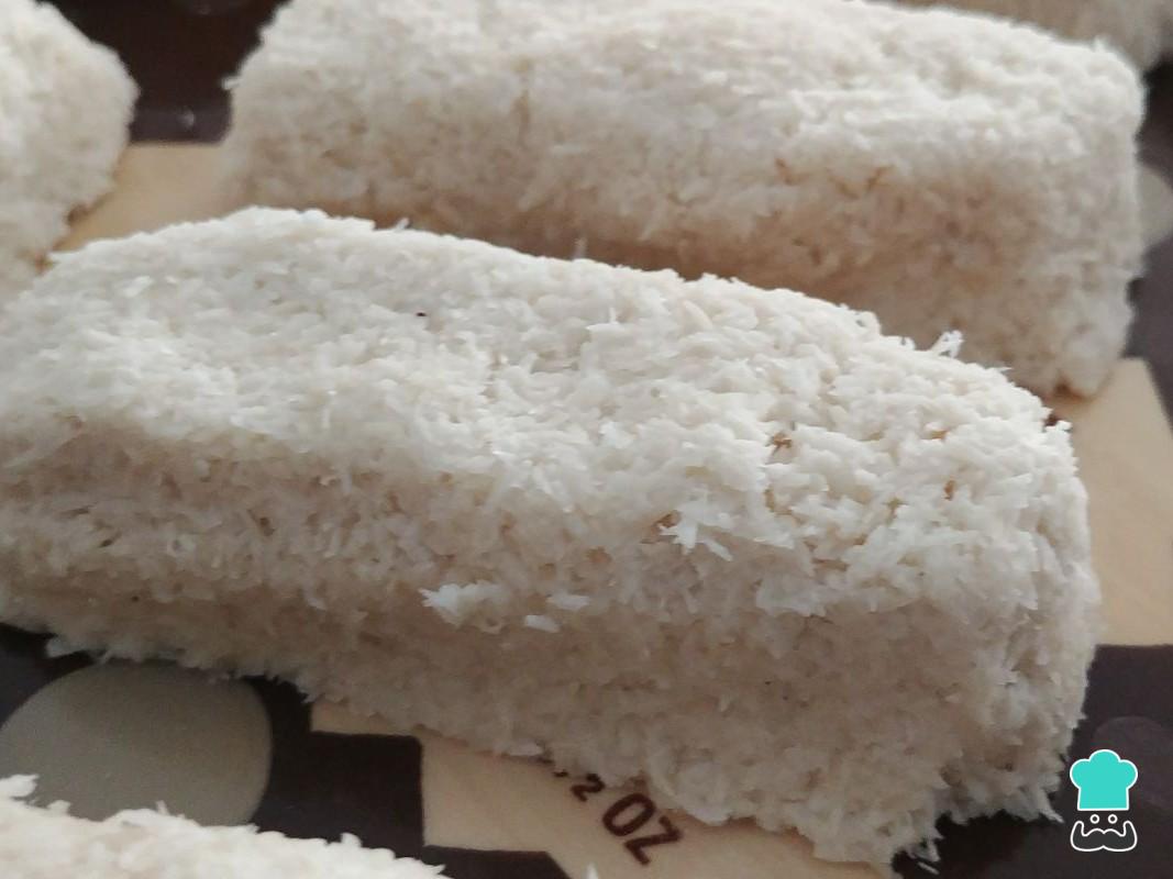 Coge porciones de masa y forma barritas de coco ovaladas y alargadas. Colócalas en una bandeja cubierta de papel de horno y déjalas en el congelador durante una hora.