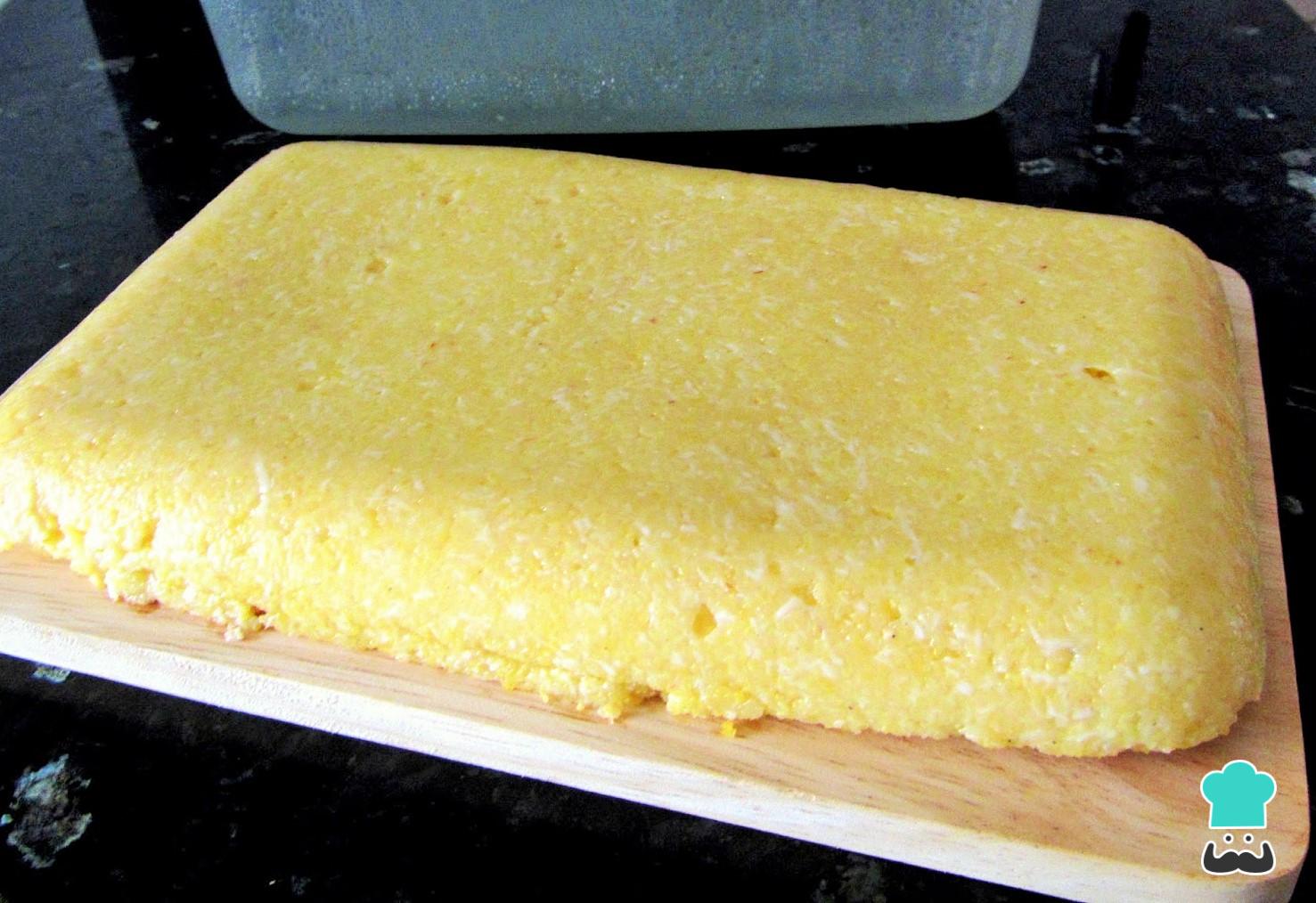 Volcar la mezcla de la polenta en un recipiente, previamente engrasado con aceite, de forma rectangular y alisar la superficie con con una cuchara o espátula húmeda. Dejar enfriar hasta que cuaje de un día para otro o como mínimo unas 4 horas.