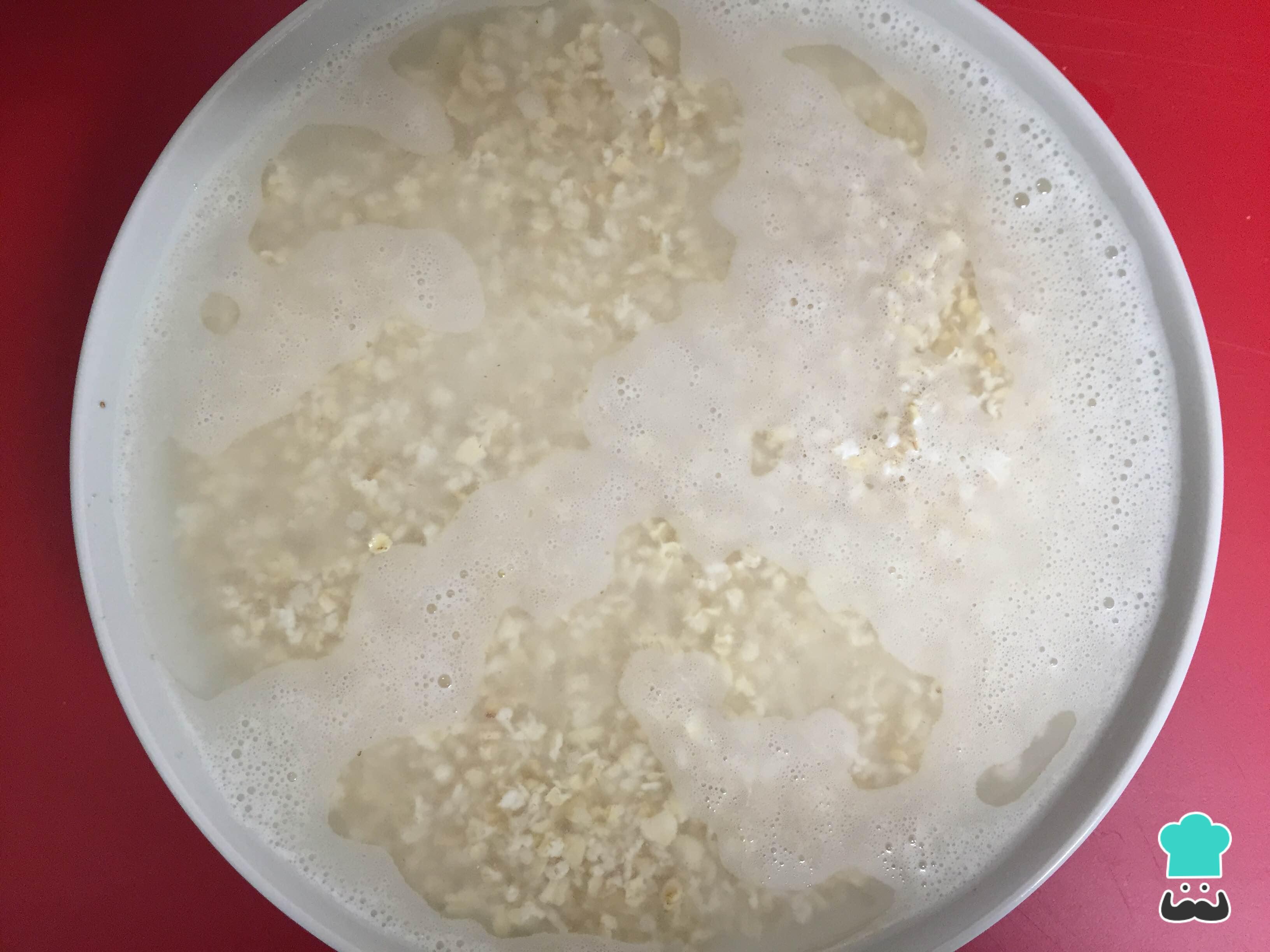 Cogemos los copos de avena, los colocamos en un recipiente grande y los cubrimos con el agua. Dejaremos la avena a remojo durante dos horas como mínimo. Si lo preferimos, podemos realizar este paso la noche de antes y dejarla durante toda la noche.