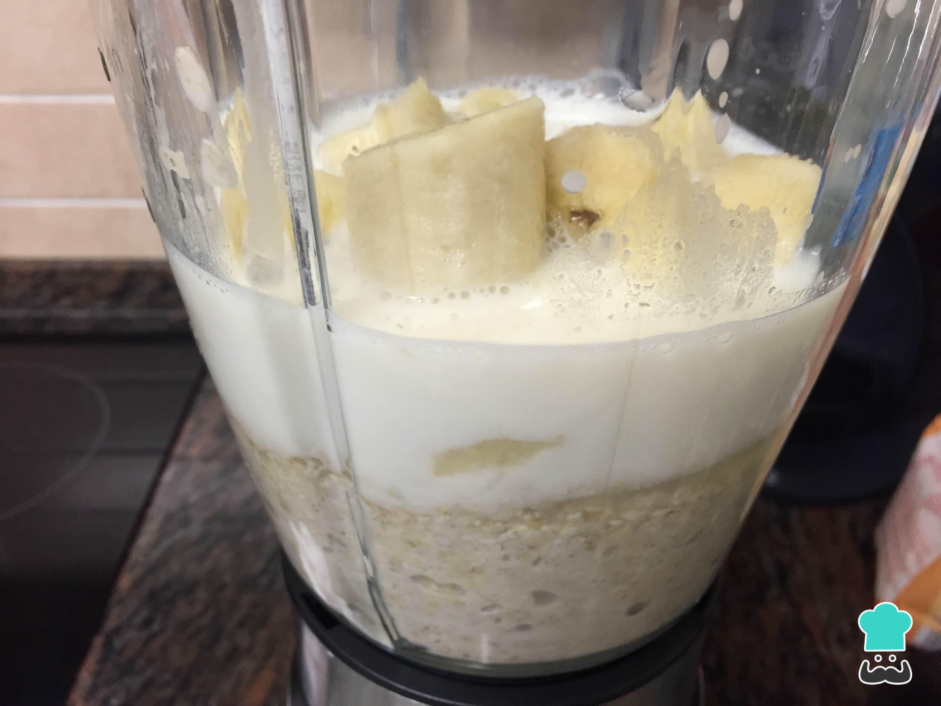 Pasado el tiempo de remojo, escurrimos la avena y colocamos los copos hidratados en el vaso de la licuadora o batidora. Aparte, pelamos los plátanos, los troceamos y los incorporamos también a la licuadora.