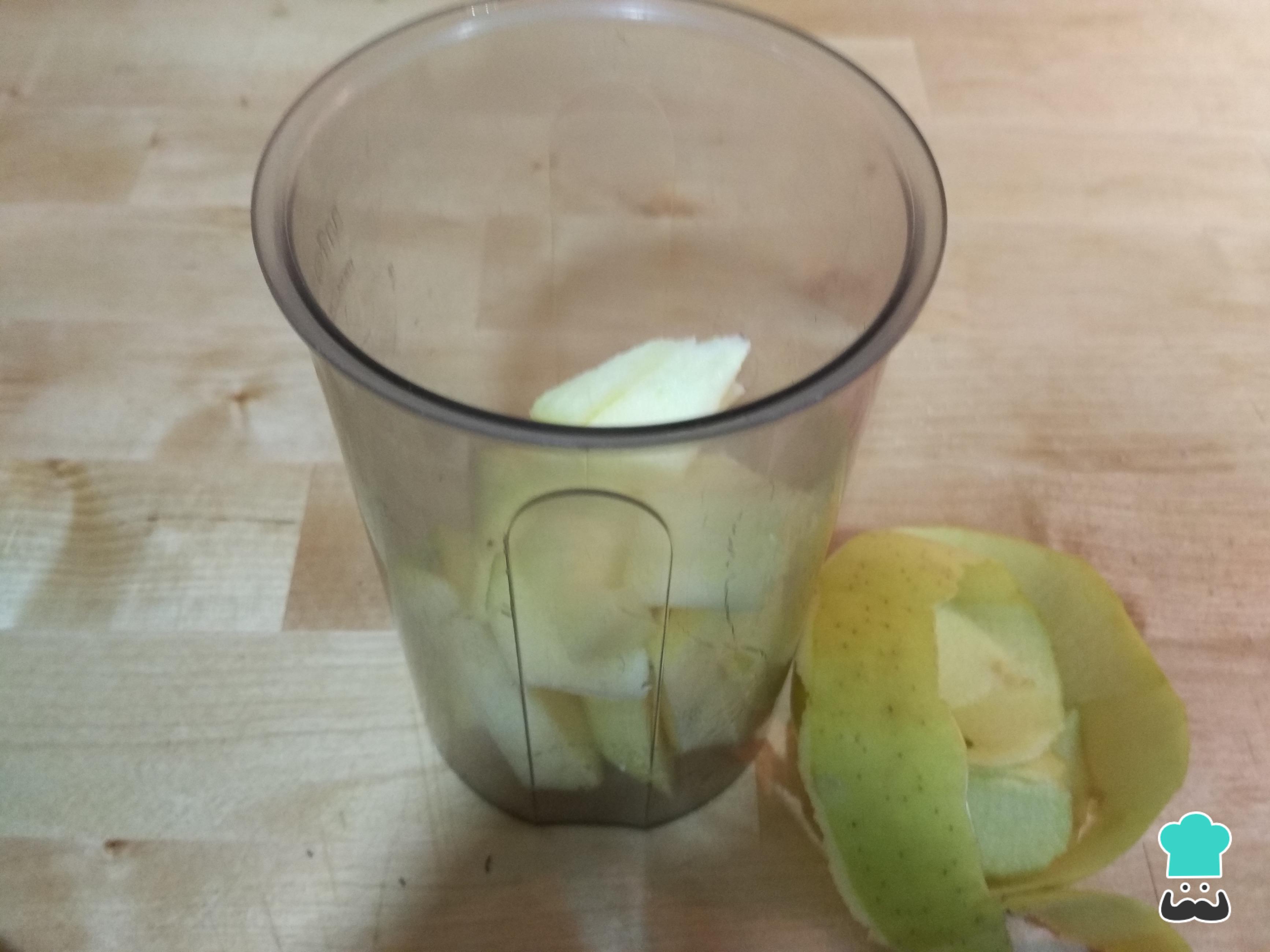 Pelamos la manzana, quitamos el corazón, la cortamos en trozos y la ponemos en el vaso de la batidora.