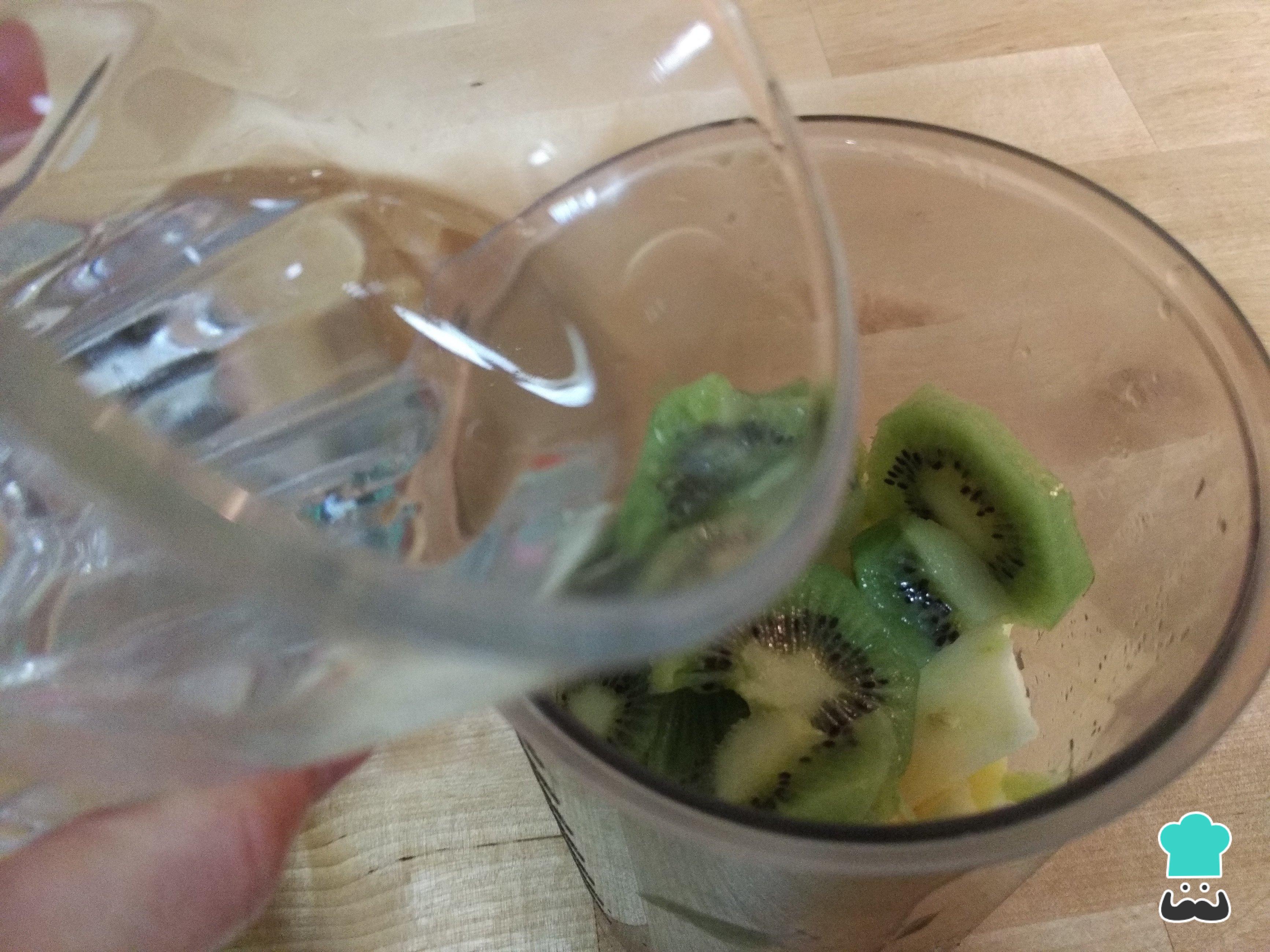 Pelamos el kiwi, lo troceamos y lo añadimos al vaso batidor. Ponemos el agua y batimos con la batidora hasta que no queden grumos.
