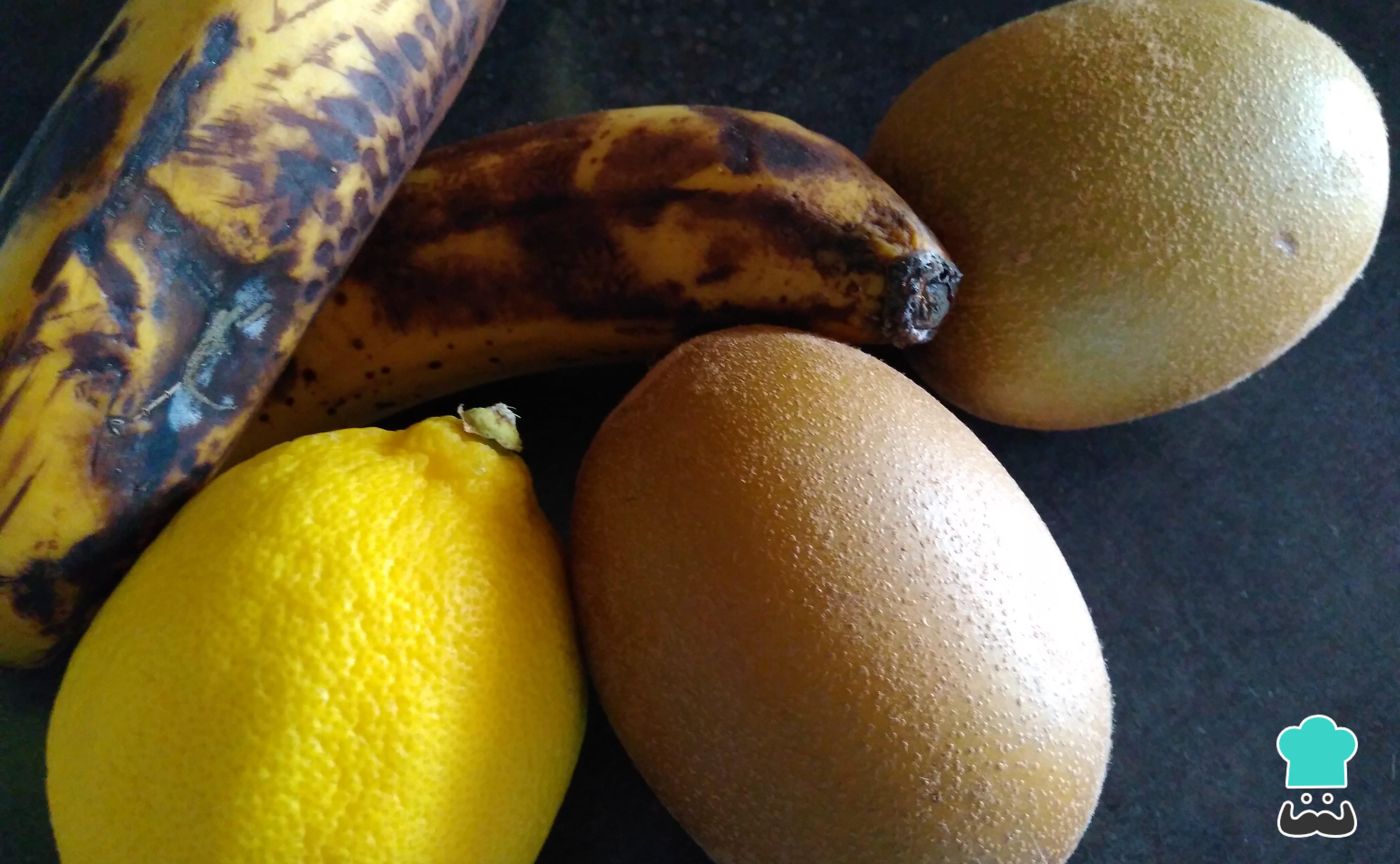Reunimos los ingredientes para preparar nuestro batido de frutas. Como ves, yo he aprovecha plátanos maduros para hacer esta receta, de hecho los plátanos maduros son mucho más dulces que los que están menos negros, así que si utilizas plátanos con este aspecto, no hará falta endulzar la bebida con azúcar o edulcorantes.
