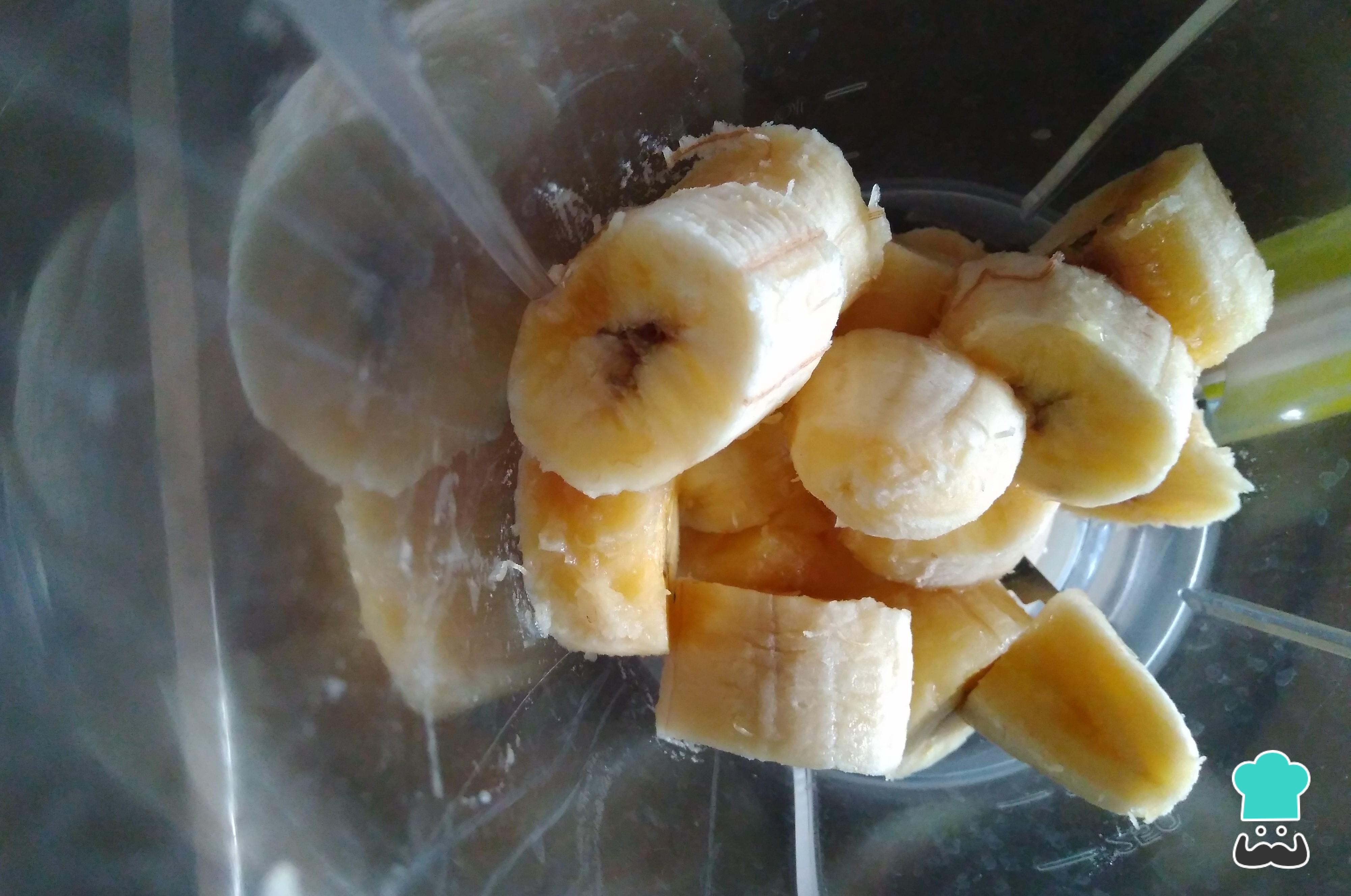 Pelamos y cortamos el plátano en rodajas, aunque todo se va a licuar, yo prefiero trocear un poco la fruta para evitar que queden grumos y ayudar la licuadora a hacer mejor su trabajo.