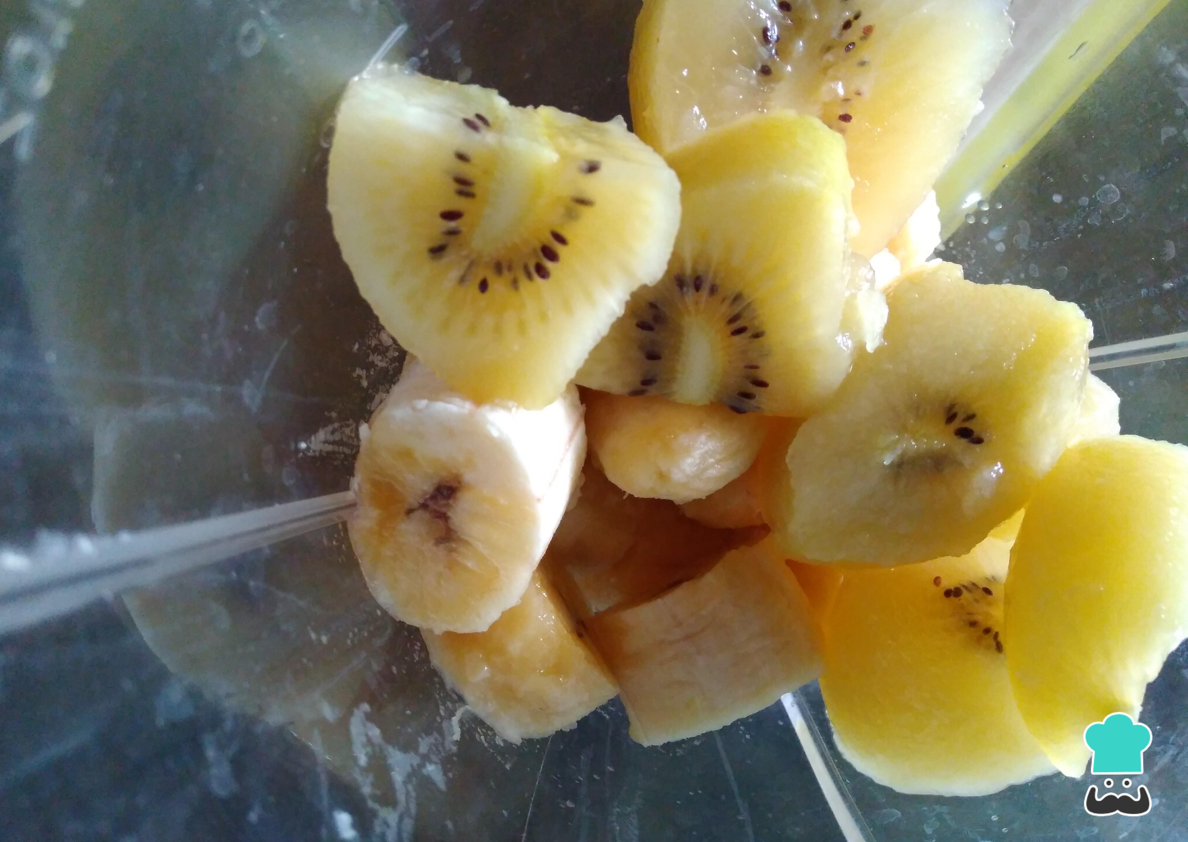 Hacemos lo mismo con el kiwi, pelamos y cortamos la fruta y la añadimos en el vaso de la licuadora. Yo he utilizado kiwis amarillos que son más jugosos, pero puedes usar el clásico kiwi verde.