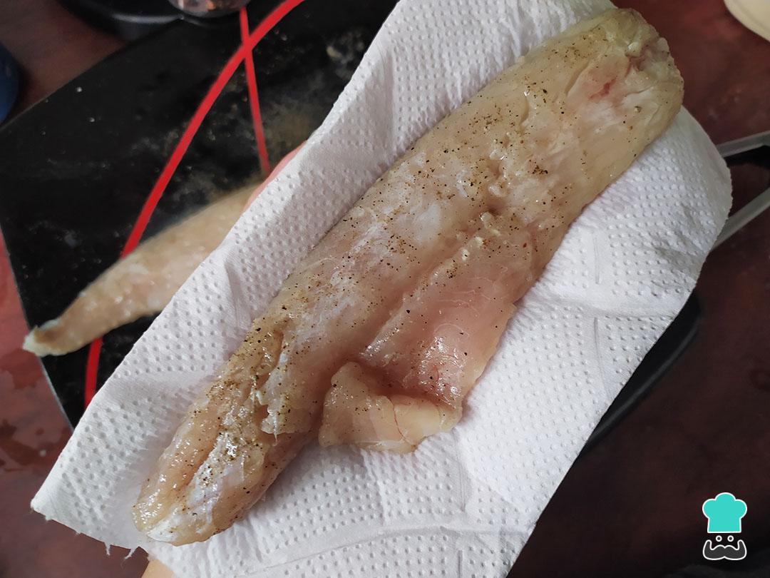 Con papel absorbente, seca el exceso de humedad de cada filete antes de sumergirlo en el batido.