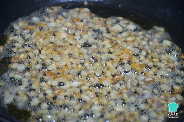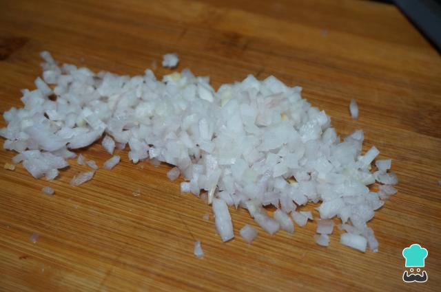 Pela y pica la cebolla en trozos muy pequeños. Si tienes pensado triturar la salsa al final, puedes picarla en trozos un poco más grandes.