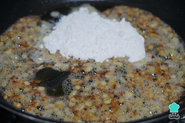 Cuando la cebolla esté dorada, agrega la harina. Recuerda que puedes usar harina de maíz o maicena para hacer la salsa bechamel de cebolla sin gluten.
