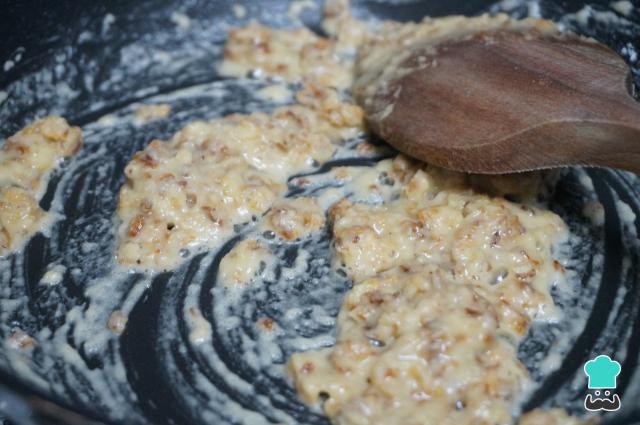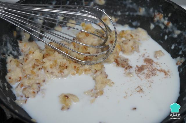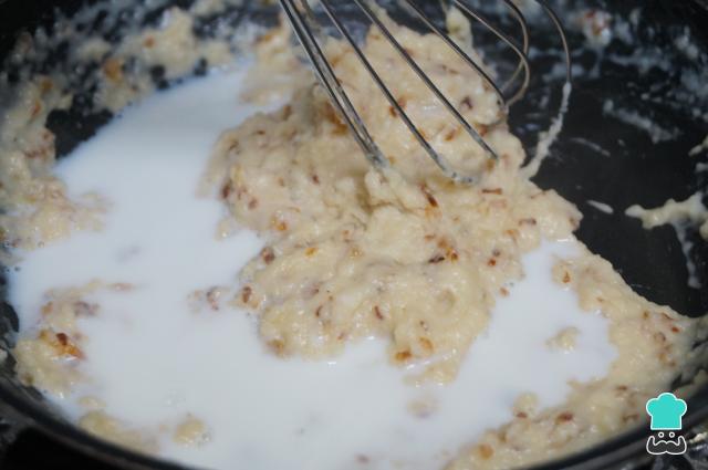 Ve añadiendo leche caliente en tandas, es decir, vierte un poco de leche y con unas varillas mezcla bien para que se vaya formando una masa cremosa.