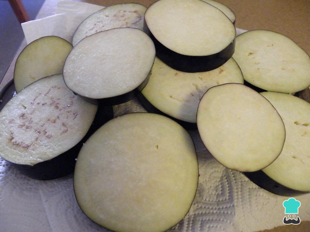 Lava muy bien las berenjenas y córtala en rodajas finas. Coloca todas las rodajas sobre una rejilla y espolvorea con sal gorda por encima de cada rodaja.
