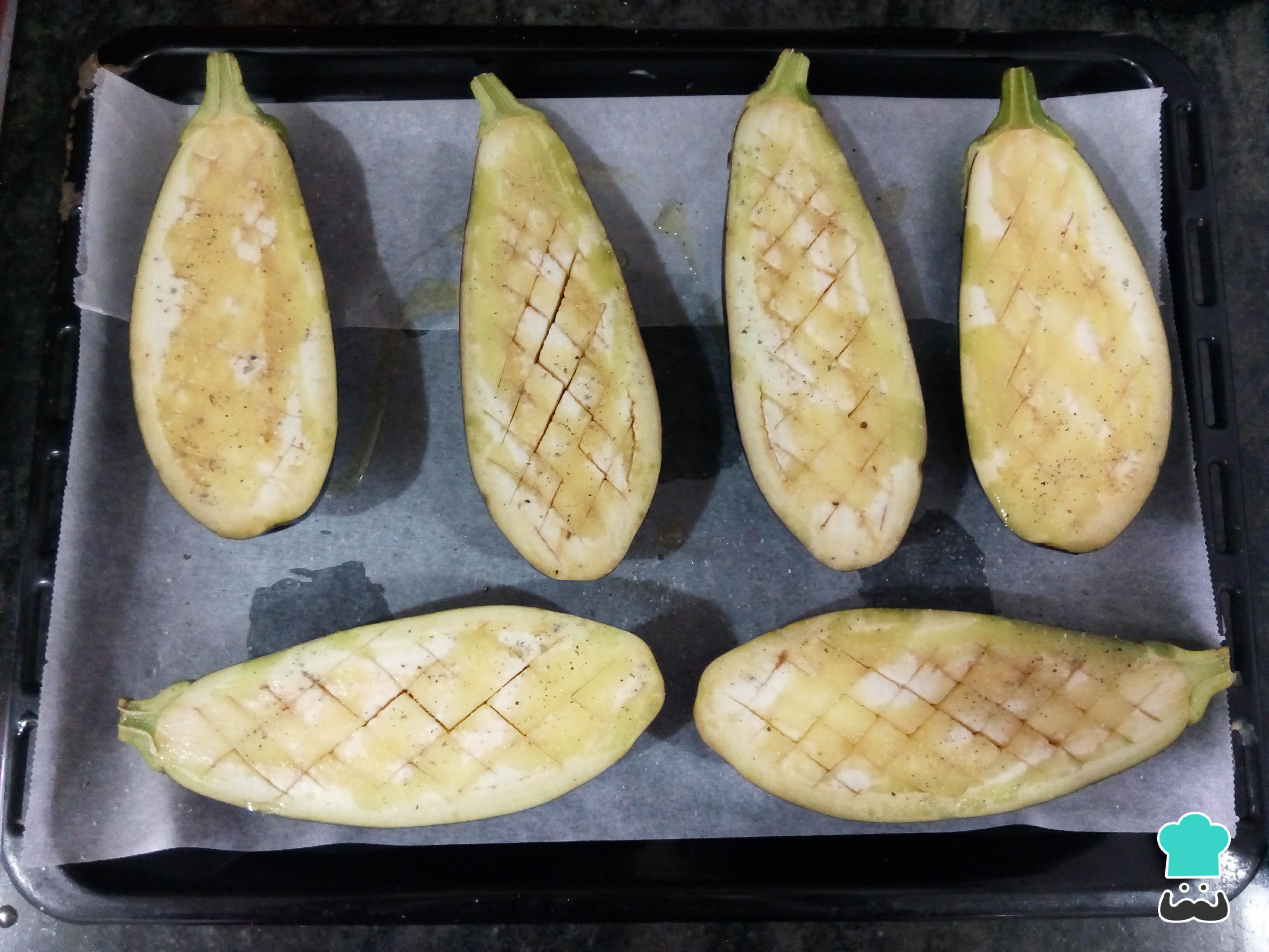 Lava bien las berenjenas y córtalas por la mitad longitudinalmente. Hazles unos cortes transversales de 1 cm de profundidad aproximadamente con la punta de un cuchillo sin llegar a cortar la piel de la verdura.