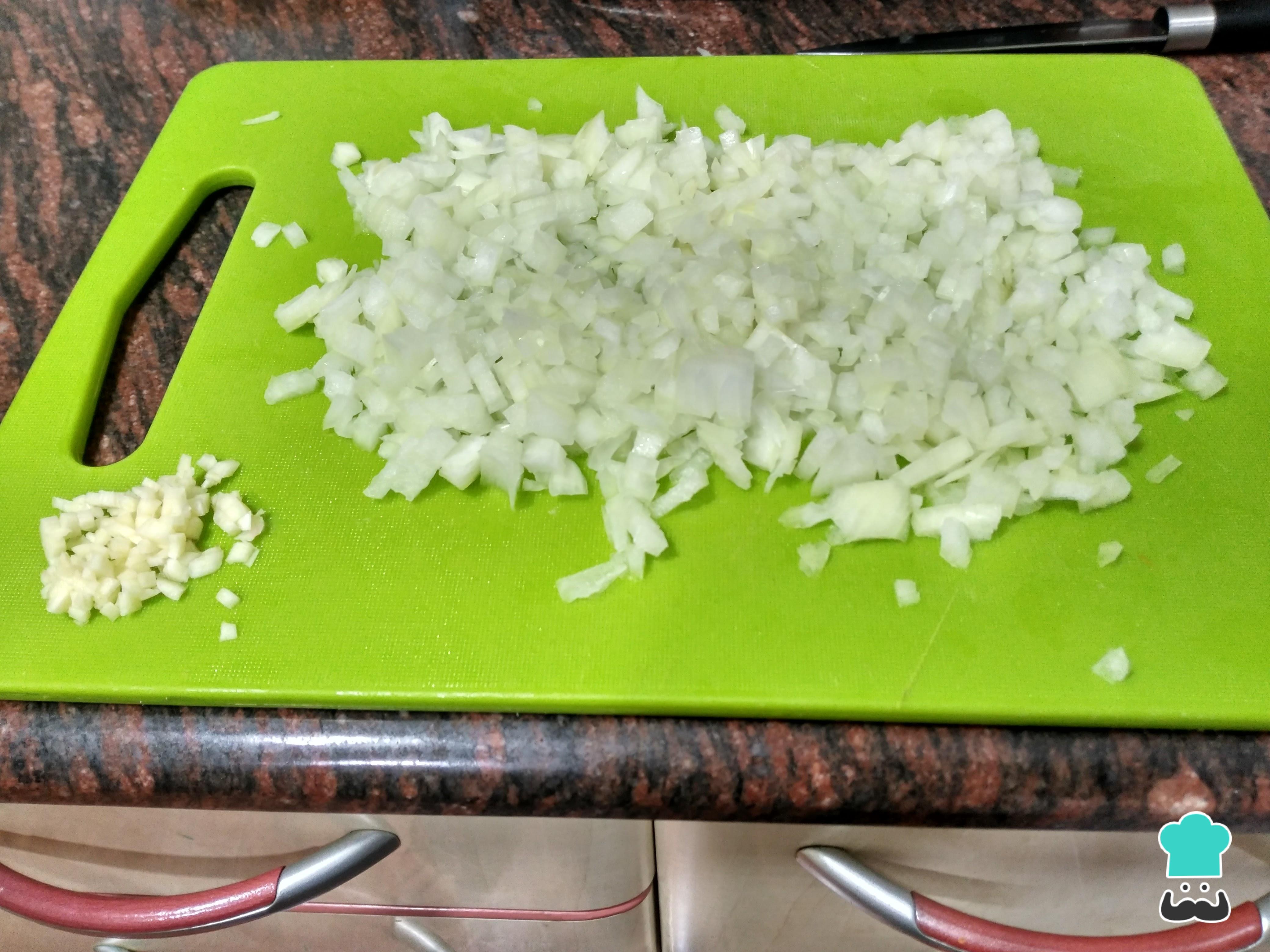 Mientras tanto, prepara el sofrito de las berenjenas rellenas vegetarianas pelando y cortando todas las verduras finamente o en trozos grandes (según tus gustos). Reserva el tomate.