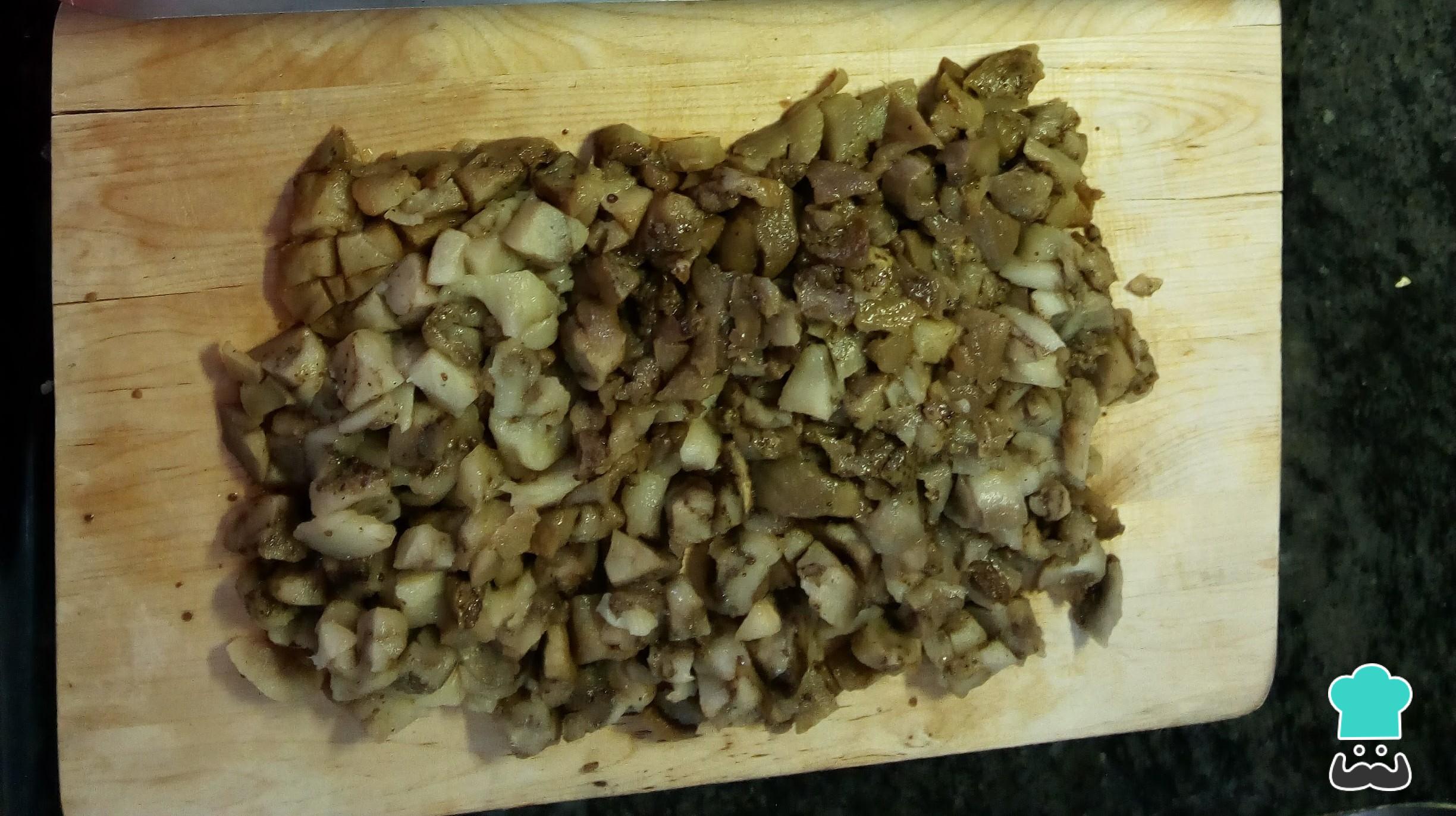Una vez las berenjenas al microondas ya estén blandas, vacíalas por dentro con ayuda de una cuchara procurando no partirles la piel. Pica la pulpa y añádela al sofrito.