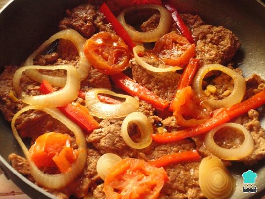 Cuando la carne ya este blanda, y con poco jugo, coloca sobre ella las rodajas de tomate y cebolla y tapa un ratito evitando que se seque y luego bájala del fuego o calor.