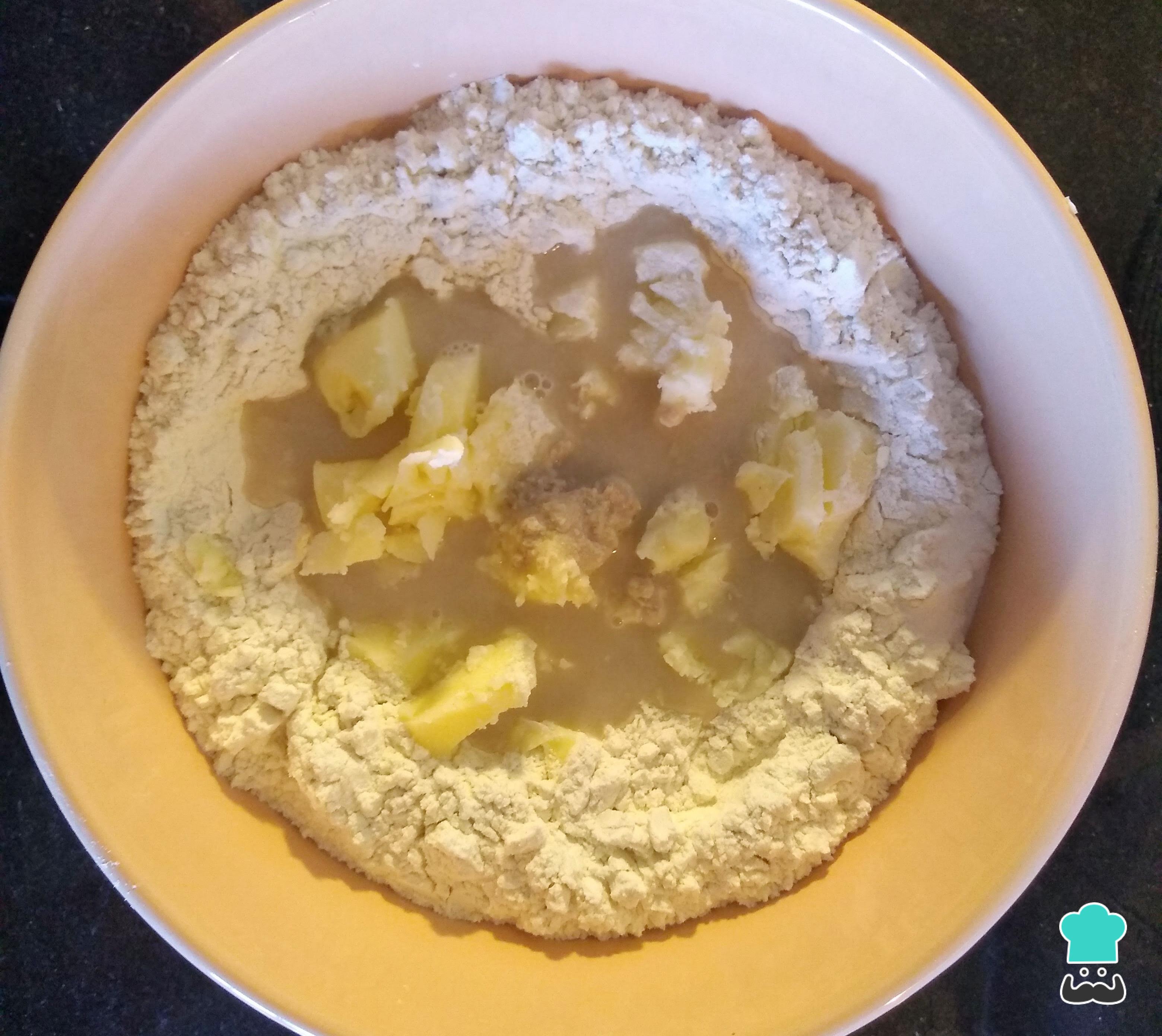 En un bol más grande, echa la harina y la sal. Haz un hueco en el centro y añade la grasa y la levadura previamente disuelta en agua tibia.