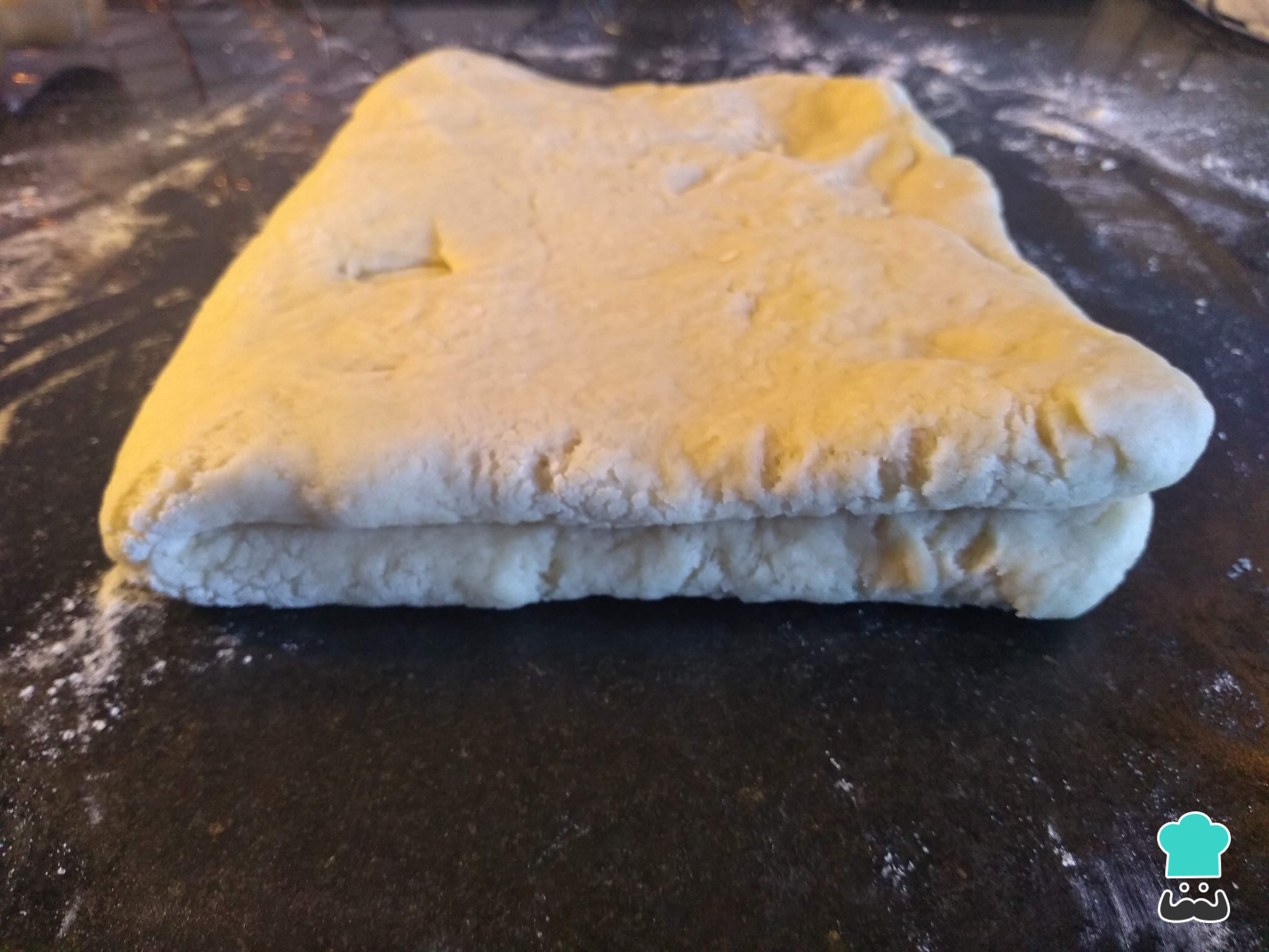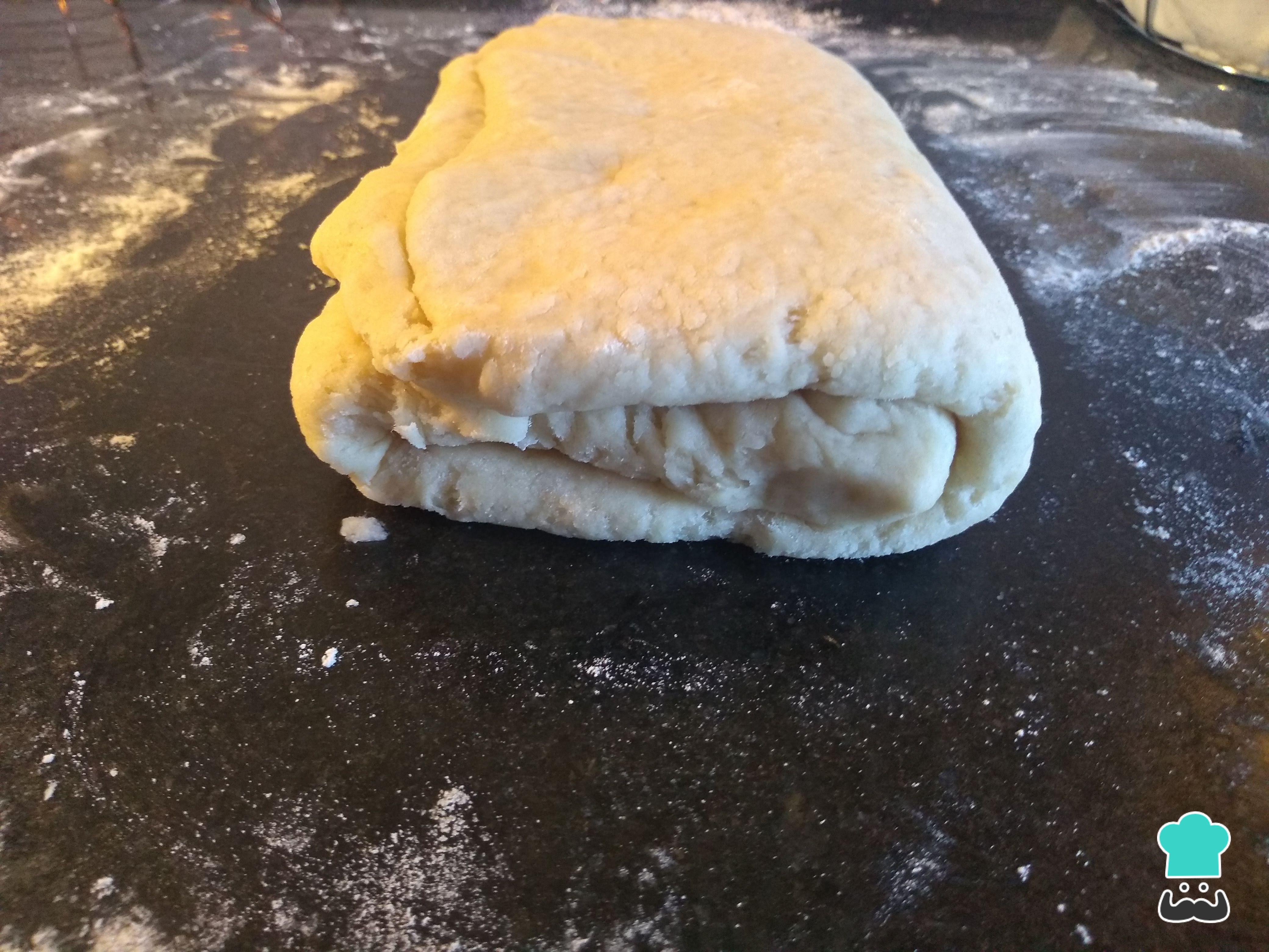 En una mesa apenas enharinada, estira la masa de forma rectangular. Haz un doble simple para que una mitad quede sobre la otra.